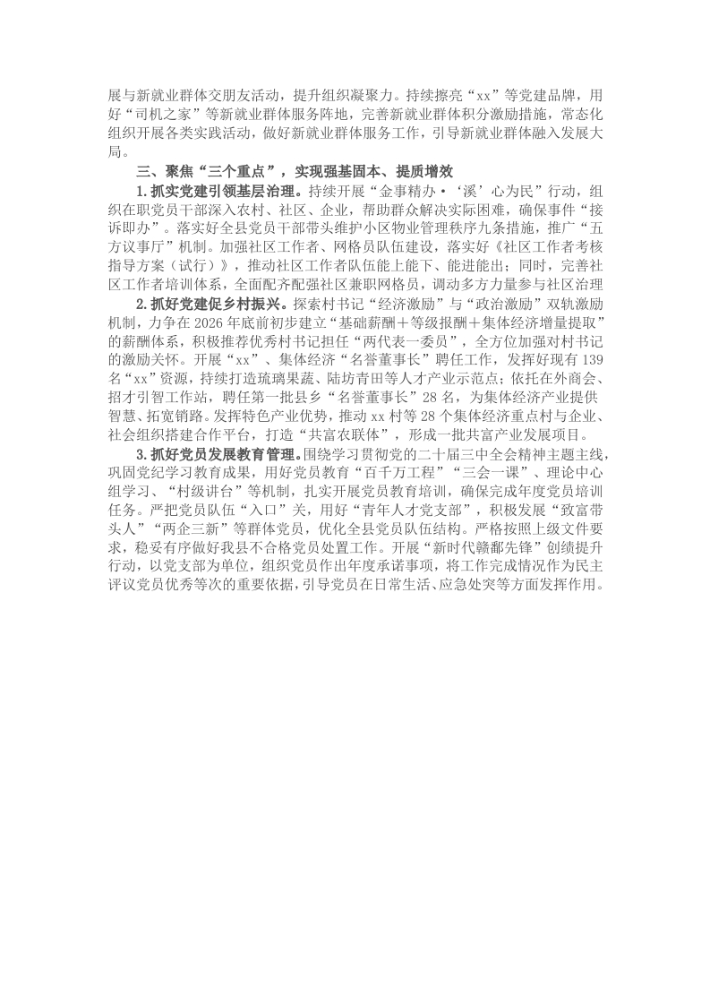 根据会议安排,xx就2025年基层党建工作思路作简要发言。一、抓好“三个层级”,做到上下联动、统筹推进1.发挥县委领航作用。注重发挥县委引领作用,用好每季度县委党建工作领导小组会议、县委常委会议等制度,定期向县委汇报党建工作情况,争取县委的支持配合。聚焦我县党建工作的品牌特色及短板弱项,提前谋划确定好2025年县委“xx”项目:持续抓好项目实施,压实相关职能部门作用,做到每季度向党建工作领导小组汇报工作进展,确保项目成效。发挥党建述职评议考核“指挥棒”作用,严格落实“述职评议未得‘好’的,年度考核不确定为‘优秀’”的工作要求,压实党建责任。2.发挥组织部门统筹协调作用。坚持部务会成员和机关干部挂点联系制度,确保每周至少下基层调研党建工作1次,重点围绕基层治理、乡村振兴、党员教育管理等重点任务,常态化跟踪党建工作成效,确保工作落实。严格督促基层党组织落实好“三会一课”、主题党日等组织生活制度,统筹推进机关、学校、公立医院等各领域党建工作,抓牢党建工作基础。以打造“xx”为抓手,健全工作链条、强化调度指导,鼓励引导Xx党支部、货车司机党支部等“两新”党组织努力探索工作特色经验,力争2025年度打造市级“xx”总量进位赶超3.发挥乡镇党建办作用。推动各乡镇选配1名党建业务熟练的优秀后备干部专职负责党建办日常工作,做到专人、专业、专岗。细化xx项党建办工作人员职责清单,指导落实周工作例会、协调研判、常态下沉、重点联系支部、督促指导Xx项工作机制,厘清机构定位和主要职能,压紧压实工作责任。每季度围绕党建工作年度计划、重点任务开展专题培训和业务指导,推动党建办顺畅运行。二、破解“三个短板”,力求精准发力、全面过硬1.破解“流动党员管理难”的短板。全面开展流动党员“三服务”行动,巩固流动党员集中登记、接收工作成果,用好流动党员管理系统,在春节前后,组织Xx余名与流动党员结对联系的村“两委”干部了解党员最新信息,更新全县流动党员名册。做好“双向共管”“后半篇文章”,加强与Xx个驻外流动党支部、Xx个流动党员服务驿站、Xx个签订共建协议流入地的沟通联络,扎实开展党员教育、管理和服务工作。发挥Xx余名“家乡推介官”队伍作用,开展“我为家乡献一策”“支部出题、党员选题”等活动,在助力振兴、促进治理上彰显作为。2.破解“村级后备干部储备难”的短板。着眼新一轮村“两委”换届,在春节和年中期间对换届任务重、干部队伍弱、解决办法差的xx个重难点村开展Xx轮再审再评,全面摸清班子结构、后备梯队情况。组织xx轮宣讲发动:第一轮由县委组织部主要领导在“xx”“xx”中开展宣讲动员:第二轮由乡镇党委在返乡人才中宣讲动员;第三轮发挥已回引能人带动效应,继续下深水找能人:做到重难点村储备xx名以上成熟可用人选。每月制定“实岗+试岗”培养计划,推动xx名村书记后备力量多形式到村参与村级事务、担任“网格员”、体验“轮值村干部”。实施村干部学历提升工程,按照县财政、乡镇、个人4:3:3的比例负担学费,确保2026年全县村党组织书记大专及以上学历达到80%以上,村“两委”成员大专以上学历达到60%以上。3.破解“新业态新就业群体党建相对薄弱”的短板。每月与社会工作部、行业主管部门召开联席会议,调度推进新业态新就业群体党建工作,形成工作合力,抓好工作落实。不断建强党员队伍,对新就业群体单列发展党员指标,重点教育培养。建立支部联系点制度和党组织书记联系党员、党员联系普通员工制度,开