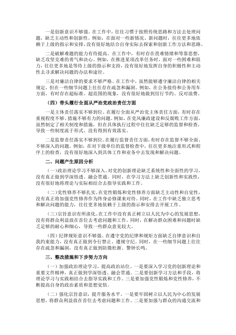 尊敬的各位领导、同志们:根据上级党委关于召开2024年度民主生活会的有关要求,我深入学习了党的二十大和二十届三中全会精神、习近平新时代中国特色社会主义思想以及党的纪律处分条例等重要文件,严格按照“四个带头”的标准,结合自身工作实际,认真查找了自身存在的问题和不足,深刻剖析了问题产生的根源,并提出了相应的整改措施。现将我的对照检查情况汇报如下,请各位同志批评指正。一、存在的突出问题(一)带头严守政治纪律和政治规矩,维护党的团结统一方面一是政治理论学习有待深化。虽然能够积极参与各类政治理论学习,但学习的深度和广度还需进一步加强。例如,在学习党的二十大精神时,虽然能够把握主要精神,但对一些细节内容和深层次的理论问题理解不够透彻,缺乏深入的探讨和思考。同时,在学习方法上较为单一,缺乏创新性,往往局限于书本学习和会议传达,没有很好地将理论与实践相结合,导致学习效果不够理想。二是政治站位有待提升。在思想上、政治上、行动上能够同党中央保持高度一致,但在具体工作中,有时缺乏从政治和全局高度去审视和思考问题,存在就事论事的现象。例如,在面对一些复杂问题时,往往更多地从本部门、本单位的利益出发,没有很好地站在党和人民的立场上去分析和解决,导致工作思路不够开阔,工作举措不够有力。三是政治敏锐性和鉴别力有待增强。在当前复杂多变的国内外形势下,对意识形态领域的斗争认识不够深刻,对一些苗头性、倾向性问题缺乏足够的警惕和鉴别力。例如,在网络上看到一些涉及党的形象和权威的负面言论时,虽然能够认识到其危害性,但往往只是停留在口头上的谴责和批评,缺乏有效的应对措施和反击手段。(二)带头增强党性、严守纪律、砥砺作风方面一是宗旨意识有所弱化。在工作中,有时存在重任务轻服务、重效率轻效果的现象,没有很好地把群众的利益放在首位。例如,在推进某项重点工作时,虽然能够按时完成任务,但在解决群众反映的困难和问题时,往往缺乏足够的耐心和细心,导致一些群众意见较大。二是管党治党责任落实不够到位。作为党员干部,在管党治党方面负有重要责任,但在实际工作中,有时存在“老好人”思想,对一些违规违纪行为视而不见、听之任之,没有及时进行批评教育和纠正。例如,在单位的考勤管理方面,虽然制定了相关制度,但在执行过程中往往不够严格,导致一些同志存在迟到早退等现象。三是工作作风不够扎实。在工作中,有时存在形式主义、官僚主义的现象,没有很好地做到求真务实、真抓实干。例如,在调研工作中,往往更多地注重形式和程序,没有深入基层一线去了解实际情况和群众需求,导致调研结果不够准确和全面。(三)带头在遵规守纪、清正廉洁前提下勇于担责、敢于创新方面