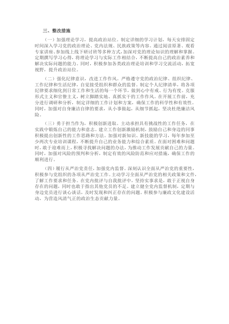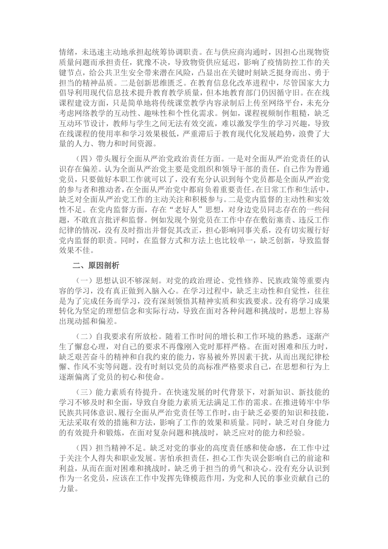 依据《关于召开2024年度组织生活会的通知》要求及局党组工作部署,我紧扣本次组织生活会主题,紧密结合自身实际,对照“四个带头”全面深入地开展自我检视,深刻剖析问题根源,并制定切实可行的整改措施。现将个人对照检查情况报告如下:一、存在的主要问题(一)带头严守政治纪律和政治规矩,维护党的团结统一方面。一是理论武装还需进一步强化。虽然能够坚持“第一议题”制度,认真学习习近平新时代中国特色社会主义思想和党的二十大及二十届三中全会精神,但在学懂弄通做实上还有差距。有时满足于学习了、领会了,但在结合社区实际,创造性贯彻落实上思考不深、研究不透。例如,在学习关于加强基层治理体系建设的文件精神时,虽然也组织了学习讨论,但在如何将文件精神与社区网格化管理、居民自治有效结合,提升社区治理效能方面,缺乏更深层次的思考和更具创新性的举措。二是政治鉴别力亟待提升。在信息爆炸的网络时代,各类资讯鱼龙混杂。如在某热门网络论坛上,常出现一些看似专业的经济分析文章,实则暗中鼓吹西方资本主义经济模式,贬低我国社会主义市场经济体制的优越性,试图误导公众认知。我在浏览时,起初未敏锐洞察其背后的不良企图,还参与了部分讨论,直至看到一些网友的错误观点被引发,才意识到问题的严重性。这充分暴露了我在复杂舆论环境下,政治鉴别能力的欠缺,对意识形态领域的潜在风险缺乏足够的警惕性,未能及时在思想舆论阵地上发挥应有的引领和守护作用。三是贯彻上级政策出现偏差。在落实乡村振兴产业扶持政策过程中,为追求短期内的产业规模增长,过度聚焦于少数大型农业企业,对其给予大量政策倾斜和资金支持,却忽视了广大中小农户和农村合作社的发展需求。在农产品加工产业扶持方面,本应均衡分配资源,促进全产业链协同发展,但实际操作中,对大型加工企业的环保标准执行、产品质量监管等环节放松要求,导致部分企业违规生产,不仅破坏了生态环境,还影响了本地农产品的市场声誉,严重偏离了乡村振兴政策的初衷,损害了整体利益,未能有效实现政策的普惠性和可持续性目标。(二)带头增强党性、严守纪律、砥砺作风方面。一是党性锻炼严重不足。日常工作中,常陷入事务主义的泥沼,忽略了党性修养的持续锤炼。例如,在参与党员志愿服务活动时,仅仅将其视为一项例行公事,未真正用心去体会服务群众的价值与意义。在为社区困难群众提供帮扶时,只是机械地完成物资发放等任务,没有深入了解他们的生活困境和内心需求,未从党性原则高度思考如何长效解决问题,更未将此过程转化为提升自身党性的契机,致使在面对私利诱惑时,容易在思想上产生动摇,难以坚守党员的精神高地。工作纪律执行不严。二是在单位的会议纪律方面,存在严重漏洞。一些重要的工作部署会议,时常有部分工作人员迟到早退,甚至在会议期间玩手机、交头接耳,严重干扰会议秩序。而作为管理者,我虽知晓这些情况,但未采取严厉有效的措施加以制止和惩处,使得这种不良风气蔓延,严重破坏了单位工作纪律的严肃性和权威性,影响了工作效率和团队凝聚力,反映出在纪律执行过程中,存在“老好人”思想,对违规行为缺乏坚决纠正的勇气和力度。(三)带头在遵规守纪、清正廉洁前提下勇于担责、敢于创新方面。一是责任担当不够积极主动。在应对突发公共卫生事件时,负责医疗物资保障工作。面对物资的紧急调配任务,由于涉及多部门协调和复杂的供应链环节,我心生畏难