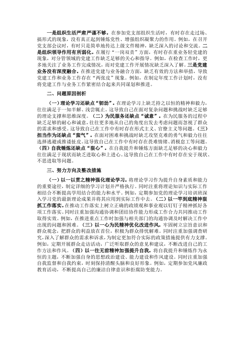 根据工作部署,我紧紧围绕本次民主生活会主题,结合自身实际情况,认真对照“四个带头”,全面深入查摆了自身存在的突出问题,认真分析了问题产生的原因,逐项明确了下一步整改措施。按照会议安排,现将个人对照检查情况汇报如下:一、存在的主要问题(一)在带头严守政治纪律和政治规矩方面一是理论学习浅层化。虽然能够按时参加集体学习,但个人自学时往往浅尝辄止,如对于党的最新理论成果,只是满足于浏览大致内容,没有深入研读其背后的深刻内涵。例如,在最近一次学习党的二十大报告时,只是大致浏览了各部分标题,对其中提到的具体政策举措和理论创新点缺乏深入思考和系统总结。二是学用结合成效差。在学习过程中,往往将理论知识与实际工作相脱节,不能很好地用理论指导实践。例如,在推进某项重点工作时,面对出现的新情况新问题,不能迅速从党的理论中找到解决办法,而是凭经验、凭感觉处理问题,导致工作进展缓慢。三是政治敏锐有欠缺。对政治形势的分析判断不够敏锐,对一些苗头性、倾向性问题缺乏足够的警觉。例如,在社交媒体上看到一些有关党的形象的负面言论时,没有第一时间予以反驳和澄清,而是采取了观望态度,这在一定程度上损害了党的形象。(二)在带头增强党性、严守纪律、砥砺作风方面一是党性修养不够主动。在日常工作中,往往忙于具体事务,忽视了对党性的锤炼和提升。例如,在参加党内政治生活时,有时存在应付心理,没有真正把自己摆进去,导致党性修养没有得到实质性提升。二是纪律执行仍有瑕疵。在遵守党的纪律方面,虽然能够做到大的方面不逾矩,但在一些细节上还存在问题。例如,在请假制度上,有时因工作繁忙没有严格按照规定履行请假手续,虽然事后进行了补报,但仍然反映出纪律意识不够强。三是落实能力有待提升。在推动工作落实上,有时存在畏难情绪,缺乏攻坚克难的勇气和毅力。例如,在推进一项涉及多个部门的重点工作时,面对协调难度大、推进速度慢的问题,没有积极寻求解决办法,而是采取了等待观望的态度。(三)带头在遵规守纪、清正廉洁前提下勇于担责、敢于创新方面一是宗旨意识树得不够牢固。在工作中,有时存在“本位主义”思想,考虑问题更多地从本部门、本单位的角度出发,没有充分站在群众的角度去思考问题。例如,在制定某项政策时,更多地考虑了政策的可操作性和便利性,而没有充分征求群众的意见和建议,导致政策在实施过程中遇到了一些困难。二是改革创新魄力有待加强。在面对新情况新问题时,往往习惯于用老办法、老思路去解决问题,缺乏创新思维和改革勇气。例如,在推进一项创新工作时,由于担心失败和承担责任,没有大胆尝试新的方法和路径,而是选择了保守的方案。三是化解矛盾风险能力不足。在面对复杂矛盾和问题时,往往缺乏有效的化解手段和方法,导致矛盾和问题得不到及时有效解决。例如,在处理一起群众信访案件时,由于缺乏对群众心理和需求的深入了解,没有采取有针对性的措施去化解矛盾,导致信访案件久拖不决。(四)带头履行全面从严治党政治责任方面