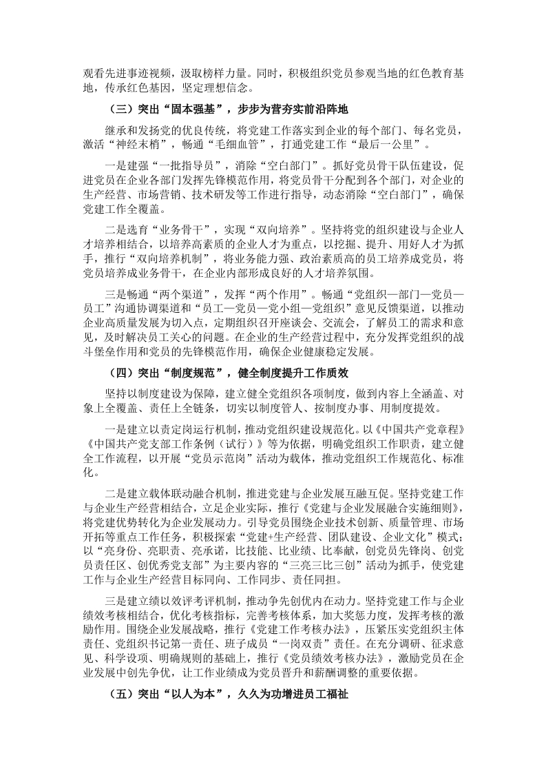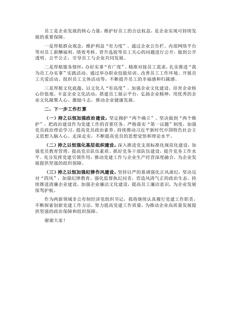 尊敬的各位领导、同志们:今年以来,我作为两新领域非公有制经济党组织书记,坚持以习近平新时代中国特色社会主义思想为指导,深入贯彻落实新时代党的建设总要求,牢固树立“党建强、发展强”的理念,抓好党组织书记这个“关键少数”,引导其在“铸魂、引领、强基、规范、民生”领题破题,切实把党建优势转化为发展优势。现将主要工作情况汇报如下:一、主要工作情况(一)突出“思想铸魂”,坚定不移加强政治建设提高政治判断力、政治领悟力、政治执行力,是党员干部增强“四个意识”、坚定“四个自信”、做到“两个维护”的应有之义,也是新时代两新领域党组织书记锤炼政治能力的必然要求。一是把稳思想之舵,提高政治判断力。自觉将党组织工作置于党和国家发展大局中分析研判、科学谋划、贯彻落实。以加强党组织在企业中的政治引领为抓手,健全党组织议事决策规则,在事关企业发展方向、涉及职工切身利益的重要事项中严格履行党组织前置讨论程序,有效发挥党组织的政治核心和引领作用。二是心系发展大局,提高政治领悟力。坚持把党组织工作融入国家经济发展战略中,积极响应国家关于推动非公有制经济健康发展的政策要求。紧扣本企业发展目标,坚持以“党建第一责任”引领和保障“发展第一要务”,通过召开管理层会议、部门会议、员工大会等形式,将党员力量集结在解决企业技术创新、产品质量提升、市场拓展等方面的堵点、难点上,以经营业绩检验党组织工作成效。三是勇担时代使命,提高政治执行力。牢记推动非公有制经济高质量发展的重大使命,坚持以高度的责任感和使命感抓好落实。坚决贯彻落实党中央及地方党委的决策部署,执行好上级党组织关于企业发展的各项工作安排,通过加强企业管理、优化生产流程、提高员工素质,为实现企业可持续发展贡献力量。(二)突出“先锋引领”,学思践悟凝聚奋进力量一是率先垂范,提升履职尽责能力水平。党组织书记自身的理论素养和业务能力直接影响着党组织的凝聚力和战斗力。坚持把学习贯彻习近平新时代中国特色社会主义思想作为首要政治任务,通过“线上+线下”“集中+自学”的方式,深入学习党的理论知识,不断在学思践悟中做到“三懂三会三过硬”(懂党务、懂业务、懂管理,会解读政策、会疏导思想、会解决问题,政治过硬、作风过硬、廉洁过硬),切实用党的创新理论武装头脑、指导实践、推动工作。二是积力众智,提升党员综合素质。建设学习型党组织是提升党员干部综合素质的重要途径,也是推动企业创新发展的重要保障。严格落实“第一议题”制度,以学习习近平新时代中国特色社会主义思想为重点,结合企业实际和发展需求,通过邀请专家授课、开展主题党日活动、组织党员交流研讨等方式,提高党员学习积极性,增强学习的针对性和实效性。三是盘活资源,提升主题教育实效。坚持把主题教育与企业日常经营管理工作相结合,充分利用“学习强国”等学习平台,组织党员学习党的最新理论成果,
