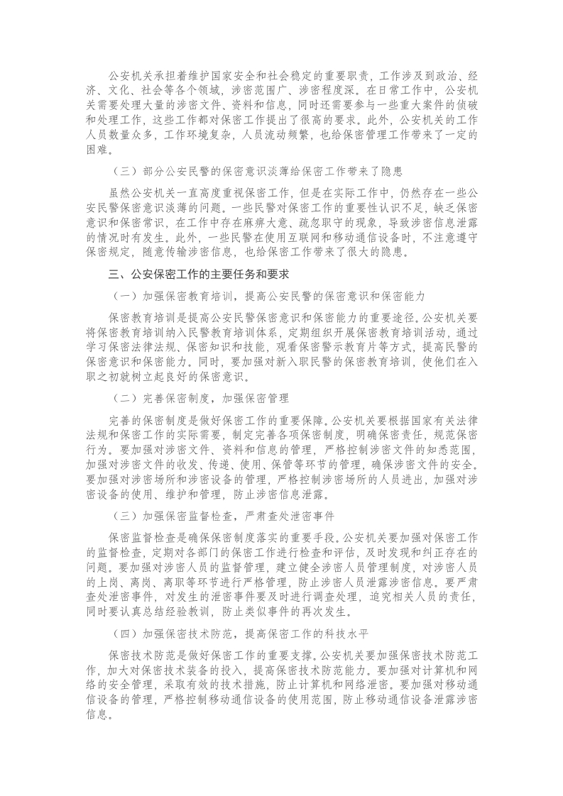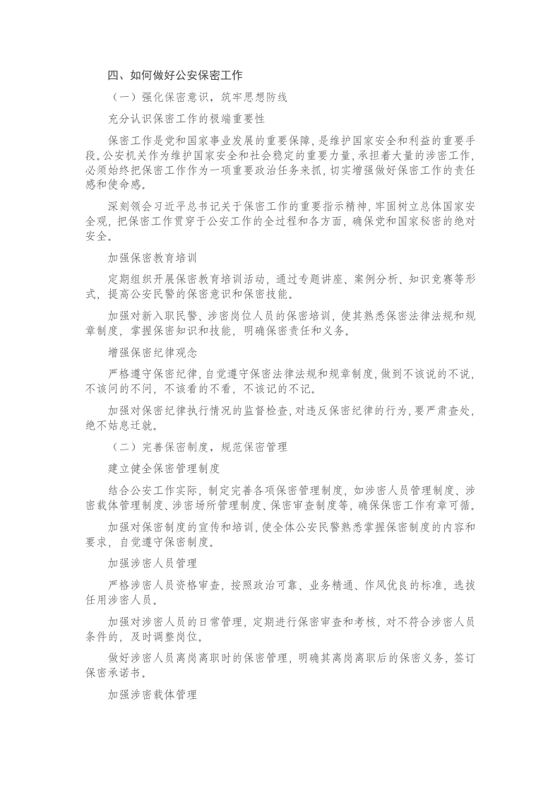 公安部门保密专题党课讲稿同志们今天,我们在这里举行公安部门保密专题党课,目的是深入学习贯彻习近平总书记关于保密工作的重要指示精神,进一步增强全体公安民警的保密意识,提高保密工作水平,确保公安工作的安全和顺利开展。保密工作是党和国家的一项重要工作,关系到国家安全和利益,关系到社会稳定和发展。公安机关作为维护国家安全和社会稳定的重要力量,承担着大量的涉密工作,保密任务十分艰巨。因此,我们必须高度重视保密工作,切实加强保密管理,确保国家秘密和警务工作秘密的安全。一、深刻认识保密工作的重要性(一)保密工作是维护国家安全的重要保障国家安全是国家生存和发展的基本前提,保密工作是维护国家安全的重要保障。在当今国际形势下,敌对势力和境外情报机构对我国的情报收集和渗透活动日益加剧,他们通过各种手段窃取我国的国家秘密和情报信息,对我国的国家安全构成了严重威胁。公安机关作为国家安全的捍卫者,必须肩负起维护国家安全的神圣使命,加强保密工作,防范和打击敌对势力的窃密活动,确保国家秘密的安全(二)保密工作是维护社会稳定的重要基础社会稳定是人民群众安居乐业的基础,保密工作是维护社会稳定的重要基础。公安机关在维护社会稳定的工作中,掌握着大量的涉及社会稳定的敏感信息和情报,如果这些信息和情报泄露,将会引发社会动荡和不稳定因素。因此,公安机关必须加强保密工作,严格控制敏感信息的知悉范围,防止信息泄露,维护社会稳定。(三)保密工作是保障公安工作顺利开展的重要条件公安工作具有特殊性和敏感性,涉及到国家安全、社会稳定和人民群众的切身利益。在公安工作中,我们需要处理大量的涉密信息和案件,如果这些信息和案件泄露,将会给公安工作带来极大的困难和阻碍,甚至会影响到案件的侦破和处理。因此,公安机关必须加强保密工作,建立健全保密制度,加强保密管理,确保公安工作的顺利开展。二、当前公安保密工作面临的形势和挑战(一)信息技术的飞速发展给保密工作带来了新的挑战随着信息技术的飞速发展,互联网、移动通信、电子政务等新技术的广泛应用,给保密工作带来了新的挑战。一方面,信息技术的发展使得信息的传播速度更快、范围更广,涉密信息的泄露风险大大增加;另一方面,信息技术的发展也使得敌对势力和境外情报机构的窃密手段更加多样化、智能化,给保密防范工作带来了更大的难度」(二)公安机关的工作性质和任务决定了保密工作的艰巨性