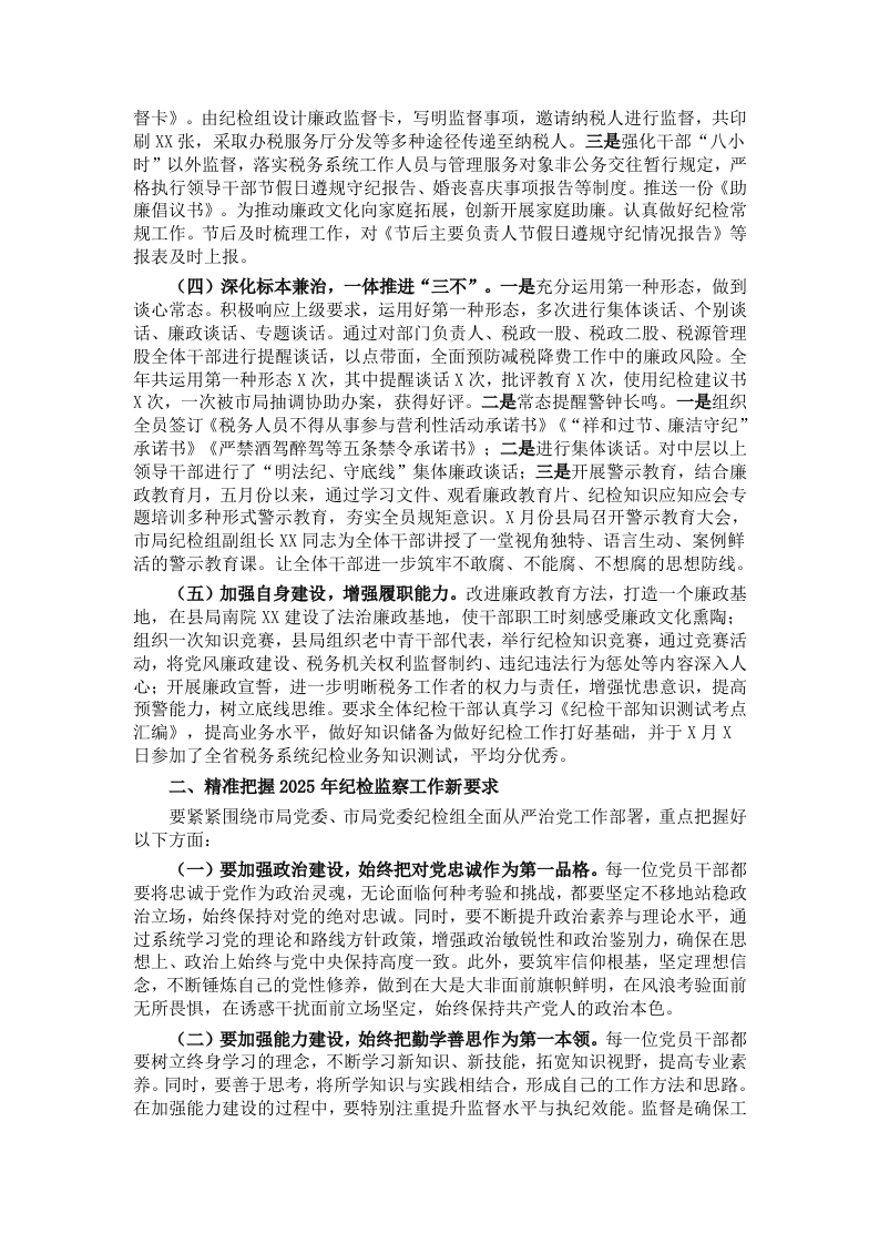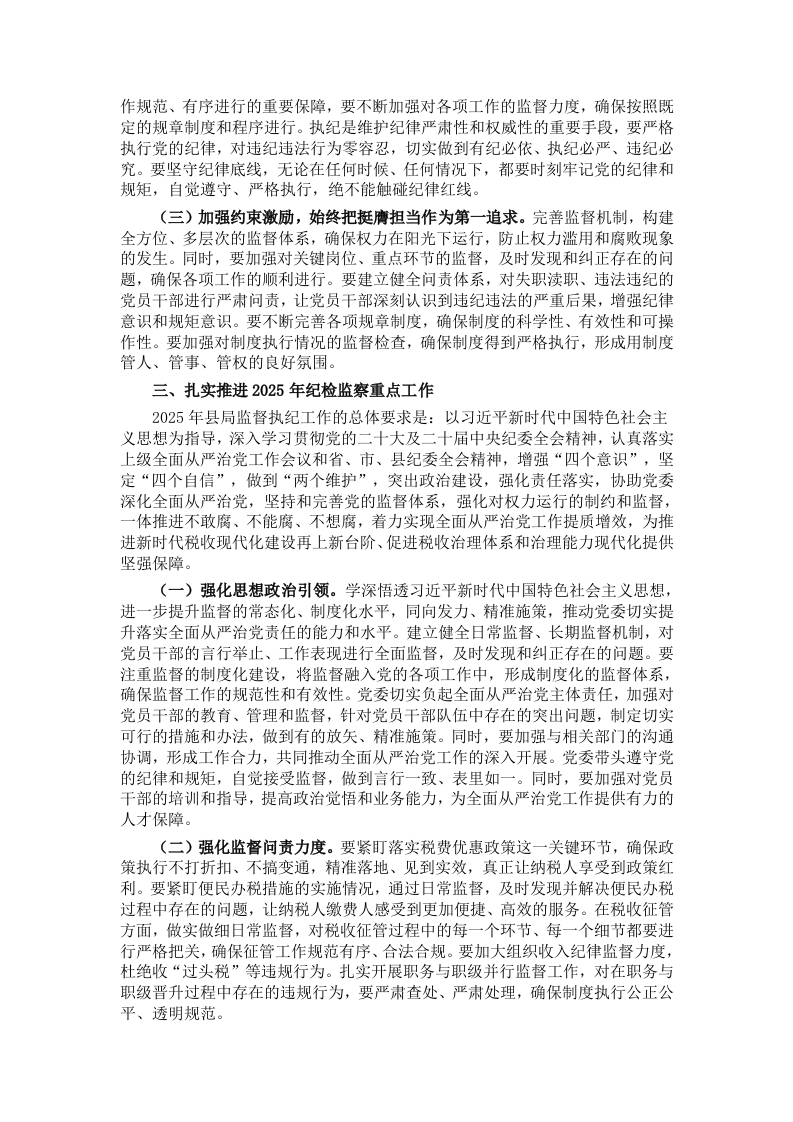 同志们:这次会议的主要任务是:贯彻落实总局、省局、市局全面从严治党工作会议部署,总结县局2024年全面从严治党工作,部署2025年重点任务。县局党委书记、局长作出了重要讲话,大家要认真学习领会、全面贯彻落实。下面,按照县局党委安排,我作监督执纪工作报告。一、2024年纪检监察工作取得新成效2024年,县局在市局纪检组和县局党委的领导下,立足监督第一职责,协助推进党委全面从严治党,突出监督执纪问责主业,主要做了以下工作:(一)突出政治建设,做到“两个维护”。认真学习习近平总书记重要讲话精神等内容,及时学习并深入贯彻习近平总书记最新重要讲话和指示批示精神,提高政治站位、政治觉悟,自觉在思想上政治上行动上同以习近平同志为核心的党中央保持高度一致,坚决落实党中央决策部署,把做到“两个维护”体现到纪检工作全过程、各方面强化政治监督,切实保障组织税费收入、落实减税降费、优化营商环境等各项重点任务落细落实,最大限度发挥纪检组的职能作用,与业务部门加强协作配合,了解督导重点,采取明察暗访、走访调研、定期座谈等多种形式,组织实施对各部门减税降费工作任务落实情况的监督检查。(二)履行监督专责,推动责任落实。一是贯彻落实《党委(党组)落实全面从严治党主体责任规定》,在履行监督责任同时,通过重大事项请示报告、提出意见建议、监督推动党委决策落实等方式,协助党委落实好主体责任,统筹推进党风廉政建设和反腐败工作。深化全面从严治党标本兼治,党委书记切实履行第一责任人职责,党委委员认真履行“一岗双责”,落实对分管部门的主要领导责任。县局党委及班子成员严格执行民主集中制,严格遵守议事程序和工作规则,“三重一大”问题集体讨论决策。二是根据上级要求开展违规收送礼品礼金及私车公养问题两个专项整治活动,并于X月X日召开“两个专项整治”督导整改暨节前廉政教育会议,针对市局纪检组关于两个专项整治工作反馈的问题与不足,对标对表,迅速整改。三是加强对税风税纪的日常监督检查,建立税风税纪监督检查常态化工作机制,聚焦作风纪律建设短板弱项,努力营造县局遵规守纪、干事创业的优良风貌。(三)强化作风建设,整治突出问题。一是高度重视,专会推进。X月X日召开党委会,学习研究省局、市局文件精神和《全省税务系统作风纪律突出问题专项整治工作方案》。召开动员会统一思想,由县局纪检组牵头,召集中层以上干部参加了作风纪律突出问题专项整治工作动员会议,确保税收工作、专项整治工作两不误,一体推进、同步发展,杜绝形式主义,防止走过场、做虚功。X月X日下午,召开局领导专题会议,纪检组长主持会议,办公室、收入核算股、纳税服务股、人教股、纪检组、第一税务分局等责任部门参加会议。各责任部门认领本部门相关工作事项,对不理解、有疑问的条款积极提问,纪检组现场答疑解惑,为顺利开展自查自纠工作提供支持。二是持续深化中央八项规定精神落实。在重要时间节点,结合中央纪委和上级的新部署新要求,制发廉政提醒,严防廉洁及“四风”问题反弹:每周末、节假日及重大时间节点在微信群发送廉政提醒及涉酒违法违纪提醒,实时转发中央纪委国家监委、X省纪委监委公开发布的典型案例。发送一个“廉政红包”。制作并分发至全局干部手中,提醒全局干部要自觉遵守廉洁纪律,牢记“十个严禁”,驰而不息纠正四风:发放一份《廉政监