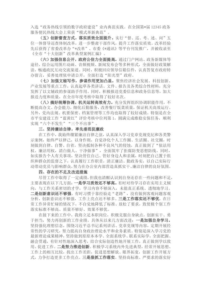 近年来,本人在各位领导和同事们的支持和帮助下,坚持以习近平新时代中国特色社会主义思想为指导,锚定工作目标,创新实干、奋力攻坚,全力以赴贯彻落实党委各项决策部署,较好的完成了各项工作任务。现将思想情况、工作情况和遵守廉政纪律情况等有关内容汇报如下:一、深化理论学习,旗帜鲜明讲政治(一)政治上做到忠诚坚定。一直以来,我坚持把对党忠诚作为必须坚守的生命线和立身之本,始终保持清醒的政治头脑,坚决维护以习近平同志为核心的党中央权威和集中统一领导,始终做到增强“四个意识”、坚定“四个自信”、做到“两个维护”。特别是严守政治纪律和政治规矩,坚决不折不扣地贯彻落实党中央决策部署,自觉抵制和批判社会上各种不当言论,以实际行动拥护以习近平同志为核心的党中央集中统一领导。(二)思想上做到强基固本。我坚持深入学习习近平新时代中国特色社会主义思想,时刻注重用党的创新理论武装头脑,坚持定期学习理论知识,自觉做到勤思深悟、入脑入心,不断增强自身政治理论水平,进一步坚定理想信念。特别是在党的二十届三中全会胜利召开后,坚持在全面学习、全面把握、全面落实上下功夫,原汁原味学习报告及有关文件,逐字逐句地阅读、思考、揣摩,切实把思想统一到党的最新精神上来,把力量凝聚到党的二十届三中全会作出的各项部署上来。(三)行动上做到自觉主动。我深刻把握当前办公室工作新任务新特点,带头执行民主集中制,落实“三重一大”决策机制,坚决贯彻上级各项决策部署,以钉钉子精神抓好各项工作落实。特别是认真落实意识形态责任制,充分认识做好新时代意识形态工作的极端重要性,用好办公室各类宣传文化阵地,高度警惕相关风险动向,及时有力处置各类风险隐患,牢牢把握意识形态话语权和主动权,确保意识形态领域安全。二、认真履职尽责,真抓实干创佳绩我紧紧围绕中心工作,立足办公室职能定位,不断强化管理、狠抓落实,在改革创新、优化营商环境、12345市民热线、信访维稳、政务公开等各项工作上均取得显著成果。(一)坚持全面从严治党,政治生态持续优化。深入推动全面从严治党主体责任落实,制定并印发《落实全面从严治党主体责任任务安排》,以严格会风会纪为抓手,营造风清气正的政治生态。探索建立《负面清单管理办法(试行)》,将11类重点工作和重要事项落实不力的情形纳入负面清单管理并定期通报,督促各单位不断提升工作执行力,营造干事创业、奋勇争先的良好氛围。(二)强化改革创新,发展活力不断激发。围绕“十大创新”推出一批力度大、创新强、举措实的重大改革事项,全面释放发展内生动力。共取得国家级改革创新经验*项,省级改革创新经验*项,*项重点改革任务完成*项,在上半年全市深化改革创新加分考核中,列第1位。(三)深化“高效办成一件事”,营商环境持续优化。突出简政放权,强化放管结合,承接落实好各类行政权力下放事项,梳理全区权限范围内审改事项*项,制发监管清单,确保审批监管有序衔接。同时,创新推出“*”营商环境品牌,上线*期“我为品牌添风采”电视访谈节目,提升重点领域服务水平。(四)推行热线智能改革,群众满意度显著提高。不断优化“热线智能转派系统”,完善工作流程,确保群众诉求派发准确、流转顺畅、处置迅速。*案例