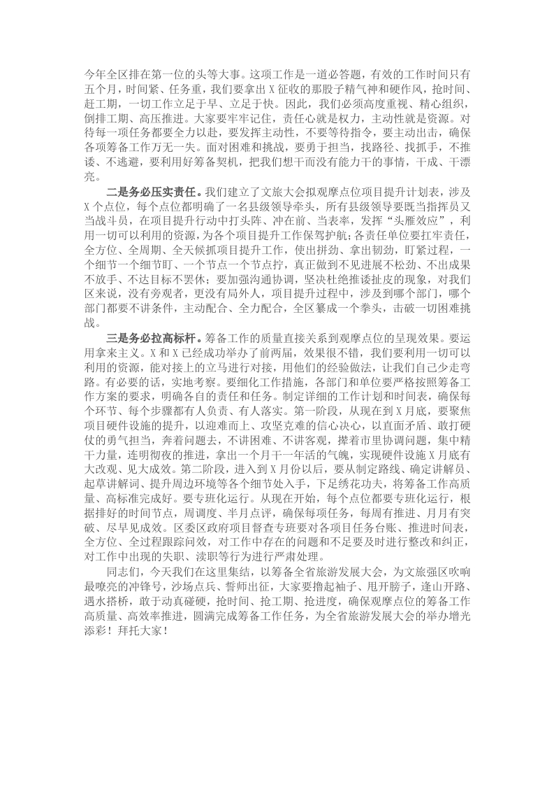 同志们:今天,我们在这里召开文物保护示范区建设暨省旅游发展大会筹备工作动员会,主要任务是深入学习习近平总书记关于文物工作的重要论述,认真落实全市建设X文物保护利用示范区动员会精神,拿出冲刺状态、鼓足攻坚劲头,高标准、高质量筹备好全省旅游发展大会涉及X的事项。刚才,X区长传达了X古城国家文物保护利用示范区建设涉及我们区创建任务,全省旅游发展大会筹备拟观摩点位涉及X区项提升任务分工,并对相关要求进行了详细说明,讲得都很具体,请大家结合实际,不讲客观、攻坚克难,抓好一项一项工作事项的推进、落实。下面,就落实好相关工作,再强调几点意见第一,要紧盯目标任务,抓实文物保护示范区创建工作。X月X日,X古城国家文物保护利用示范区建设正式启动,这是自X年X成功入选第二批国家文物保护利用示范区创建名单以来的又一个重要节点,预计X年X月接受国家文物局的考核验收。国家文物保护利用示范区是由国家文物局同意设立并指导管理,具有全国性示范引领意义的特定区域。X古城国家文物保护利用示范区的范围包括X城墙围合的X平方公里核心区和X平方公里的拓展区,共计约X平方公里。我们区拥有丰富的文物资源,共有X处不可移动文物,是全市数量较多、位置较为集中的区域。建设文物保护利用示范区,就是要让这些珍贵的文物“活”起来,成为传承和弘扬中华优秀传统文化的重要载体,成为我们区文旅高质量发展新的支撑点。一是抓好文物保护。文物保护是底线,管理是关键。大家要履行好文物保护行业责任、属地责任,要以正在开展的第四次全国文物普查为契机,全面摸排各类文物、掌握辖区文物“家底”,为科学实施文物保护提供依据:要压实文保单位安全责任,进一步完善文物安全网络体系,配齐配全文物保护单位的安防、消防设施,用好文物保护专家库,强化人防技防智防。特别是要高度重视消防安全,加强隐患排查整治。二是深挖文物价值。文物的利用和活化是文物保护的最终目的。这就要求我们要进一步深入研究文物的历史、艺术、科学价值,挖掘文物的文化内涵,推动文物与旅游、教育、科技等领域的融合。我们区作为文旅强市的核心区、作为全市推动全域旅游的先行示范区,更要思考示范区建设与文旅的深度融合,依托现有的文物资源,进一步挖掘文化特色、引入科技元素,注重文物展示活化利用上的创新,探索发展文创产品、研学旅游等新业态,特别是依托文物资源打造多元化的文化体验场景,讲好文物故事,推动丰富的文化遗产资源创造性转化、创新性发展。三是密切协作推进。按照示范区创建任务分工和“文物+”工作调度协调机制,切实把示范区建设提上重要日程,迅速把创建任务项目化、清单化、明细化,各乡(办)、各职能部门要对本辖区、本单位的创建任务、薄弱环节和应对举措心中有数,推动建设工作深入开展。要充分利用各类宣传文化阵地和载体,积极宣传文物保护法规政策和工作成效、先进典型,鼓励社会力量参与文物保护利用和示范区建设中来,形成全社会关注、支持、参与的创建氛围。第二,拿出冲刺状态、鼓足攻坚劲头,高标准高质量筹备好全省旅游发展大会。一是务必提高认识。我们作为X市旅游的核心区域,全省旅游发展大会是我们展示文旅强区发展成果、提升知名度和影响力的重要契机,所以说筹备工作是