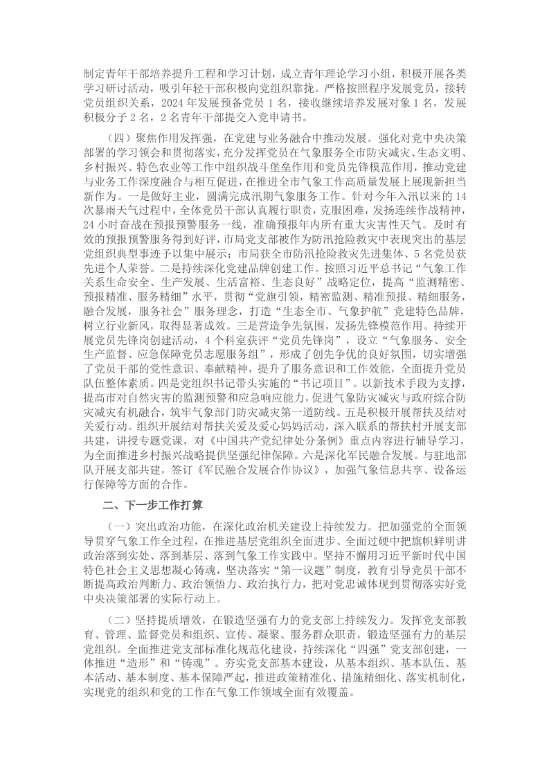 过去一年,我始终坚持以习近平新时代中国特色社会主义思想为指导,深入学习贯彻落实党的二十大、二十届二中、三中全会精神,扎实开展党纪学习教育,全面贯彻落实习近平总书记关于气象工作及防灾减灾工作重要指示批示精神,以创建“四强”党支部为核心目标,持续推动党建和业务相融合,党支部的凝聚力战斗力不断增强,为推动气象工作高质量发展,服务地方社会经济发展提供重要的政治保证。一、主要工作情况(一)聚焦政治功能强,筑牢基层组织的战斗堡垒。牢牢把握“政治机关”职责定位,深刻领悟“两个确立”的决定性意义,把带头做到“两个维护”作为首要政治任务。一是坚持全面从严治党,增强思想政治建设。坚持以政治过硬引领工作过硬,认真落实“第一议题”制度,立足气象的主责主业,深入学习贯彻习近平总书记的重要讲话和重要指示精神,结合工作实际交流研讨,在真学真懂真用中坚定政治信仰、站稳政治立场、提升政治能力。二是深化主题教育成果,扎实开展党纪学习教育。坚持不懈用习近平新时代中国特色社会主义思想凝心铸魂,通过书记领学、支委促学、党员自学等方式,在深化内化转化上持续用力。扎实推进党纪学习教育走深走实,不断强化学纪、知纪、明纪、守纪,把各项规定要求落到实处。三是认真落实气象高质量发展总要求。要求全市气象部门干部职工要认真学习领会习近平总书记关于气象工作及防灾减灾工作重要指示批示精神和视察全市重要讲话重要指示精神,主动做好针对性气象服务保障工作,聚焦加快推进气象科技能力现代化和社会服务现代化全市实践的各项重点任务,扎实推进全市气象事业高质量发展。(二)聚焦支部班子强,落实党建工作主体责任。以提升党支部组织力为重点,坚持年初有计划、日常有指导、推进有抓手,着力抓基础促提质,推进党建工作全面进步、全面过硬。一是严格落实党建第一责任人职责。选优配强党支部书记和委员,支部委员明确分工、各负其责,严格落实“一岗双责”。党支部书记带头加强学习、带头率先示范,发挥“领头雁”的主导性、关键性作用。坚持引领党支部建设和业务工作相融合,支部委员积极履职尽责,切实担负起组织者、推动者、实践者的责任,发挥示范带动作用。二是加强基层组织建设,严格落实组织生活制度。严格落实“三会一课”制度,不断创新内容与方式,实现制度常态化,全力打造党内组织生活新常态,不断创新丰富组织生活,开展重温入党誓词、为党员过“政治生日”,并结合实际开展现场教学,不断增进对党的创新理论的政治认同、思想认同、理论认同、情感认同。三是加强党员学习教育管理。召开组织生活会,广泛开展谈心谈话,积极征求意见,紧密联系思想和工作实际,严肃开展批评和自我批评,对照查摆问题,制定整改措施。(三)聚焦党员队伍强,在从严治党中锤炼队伍。坚持从严从实抓好支部党员队伍建设,积极为党员干部搭台子、压担子,引导在气象工作实践中积极担当作为。一是提升政治素质,激发组织活力。不断提高工作能力水平,激发党员干部的积极性、主动性、创造性。开展“向身边党员学习”活动,鼓励党员干部以身边人为师、从高质高效工作中汲取经验,相互学习、共同提高。二是严格教育管理,筑牢廉洁底线。在重要节点和节日前进行廉洁提醒,组织观看警示教育片、讲廉洁小故事等形式常态化开展警示教育,经常性开展谈心谈话,及时掌握支部党员思想动态,引导党员筑牢拒腐防变思想防线。三是加强年轻干部的锻炼培养。