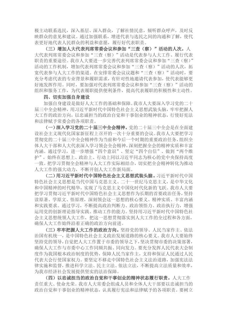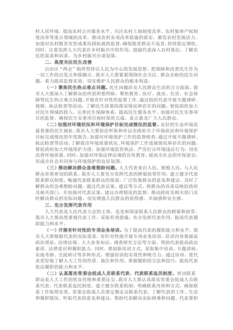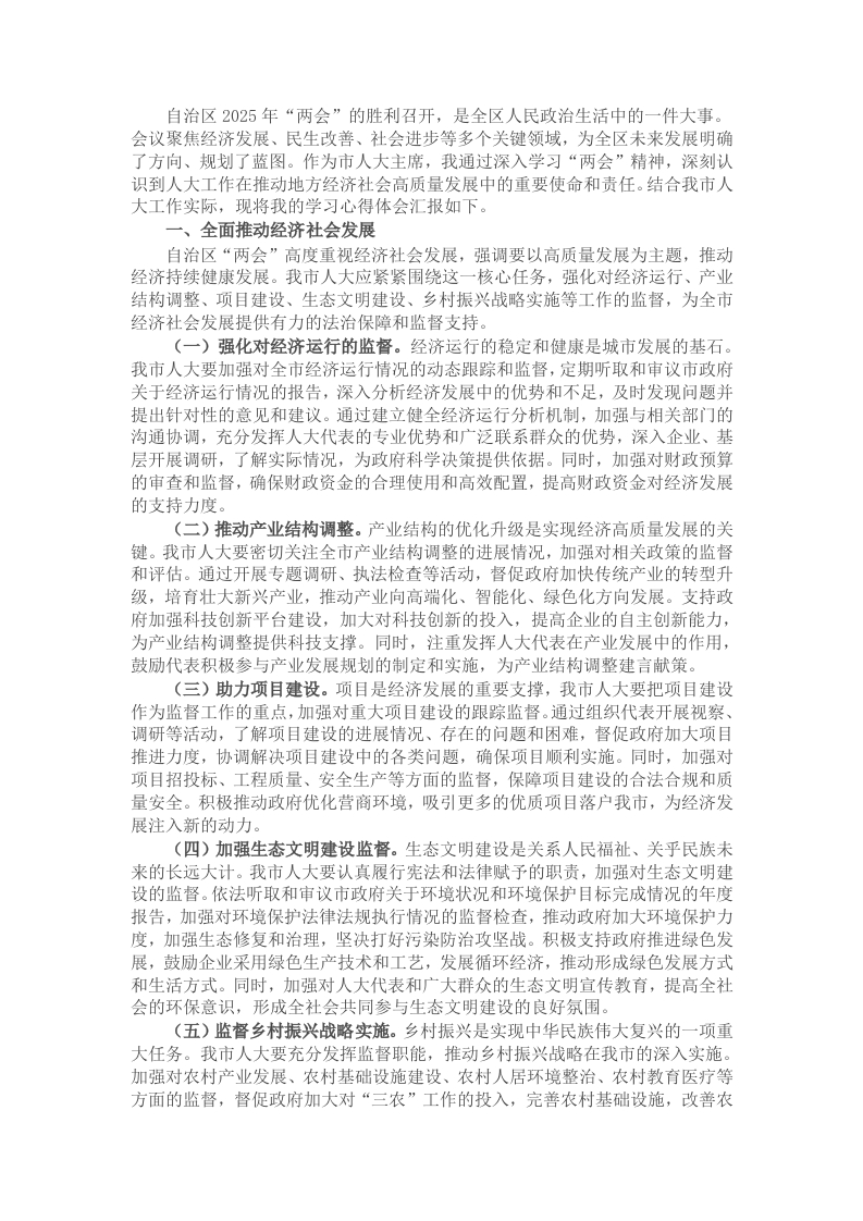 自治区2025年“两会”的胜利召开,是全区人民政治生活中的一件大事。会议聚焦经济发展、民生改善、社会进步等多个关键领域,为全区未来发展明确了方向、规划了蓝图。作为市人大主席,我通过深入学习“两会”精神,深刻认识到人大工作在推动地方经济社会高质量发展中的重要使命和责任。结合我市人大工作实际,现将我的学习心得体会汇报如下。一、全面推动经济社会发展自治区“两会”高度重视经济社会发展,强调要以高质量发展为主题,推动经济持续健康发展。我市人大应紧紧围绕这一核心任务,强化对经济运行、产业结构调整、项目建设、生态文明建设、乡村振兴战略实施等工作的监督,为全市经济社会发展提供有力的法治保障和监督支持(一)强化对经济运行的监督。经济运行的稳定和健康是城市发展的基石。我市人大要加强对全市经济运行情况的动态跟踪和监督,定期听取和审议市政府关于经济运行情况的报告,深入分析经济发展中的优势和不足,及时发现问题并提出针对性的意见和建议。通过建立健全经济运行分析机制,加强与相关部门的沟通协调,充分发挥人大代表的专业优势和广泛联系群众的优势,深入企业、基层开展调研,了解实际情况,为政府科学决策提供依据。同时,加强对财政预算的审查和监督,确保财政资金的合理使用和高效配置,提高财政资金对经济发展的支持力度。(二)推动产业结构调整。产业结构的优化升级是实现经济高质量发展的关键。我市人大要密切关注全市产业结构调整的进展情况,加强对相关政策的监督和评估。通过开展专题调研、执法检查等活动,督促政府加快传统产业的转型升级,培育壮大新兴产业,推动产业向高端化、智能化、绿色化方向发展。支持政府加强科技创新平台建设,加大对科技创新的投入,提高企业的自主创新能力,为产业结构调整提供科技支撑。同时,注重发挥人大代表在产业发展中的作用,鼓励代表积极参与产业发展规划的制定和实施,为产业结构调整建言献策。(三)助力项目建设。项目是经济发展的重要支撑,我市人大要把项目建设作为监督工作的重点,加强对重大项目建设的跟踪监督。通过组织代表开展视察、调研等活动,了解项目建设的进展情况、存在的问题和困难,督促政府加大项目推进力度,协调解决项目建设中的各类问题,确保项目顺利实施。同时,加强对项目招投标、工程质量、安全生产等方面的监督,保障项目建设的合法合规和质量安全。积极推动政府优化营商环境,吸引更多的优质项目落户我市,为经济发展注入新的动力(四)加强生态文明建设监督。生态文明建设是关系人民福祉、关乎民族未来的长远大计。我市人大要认真履行宪法和法律赋予的职责,加强对生态文明建设的监督。依法听取和审议市政府关于环境状况和环境保护目标完成情况的年度报告,加强对环境保护法律法规执行情况的监督检查,推动政府加大环境保护力度,加强生态修复和治理,坚决打好污染防治攻坚战。积极支持政府推进绿色发展,鼓励企业采用绿色生产技术和工艺,发展循环经济,推动形成绿色发展方式和生活方式。同时,加强对人大代表和广大群众的生态文明宣传教育,提高全社会的环保意识,形成全社会共同参与生态文明建设的良好氛围。(五)监督乡村振兴战略实施。乡村振兴是实现中华民族伟大复兴的一项重大任务。我市人大要充分发挥监督职能,推动乡村振兴战略在我市的深入实施。加强对农村产业发展、农村基础设施建设、农村人居环境整治、农村教育医疗等方面的监督,督促政府加大对“三农”工作的投入,完善农村基础设施,改善农