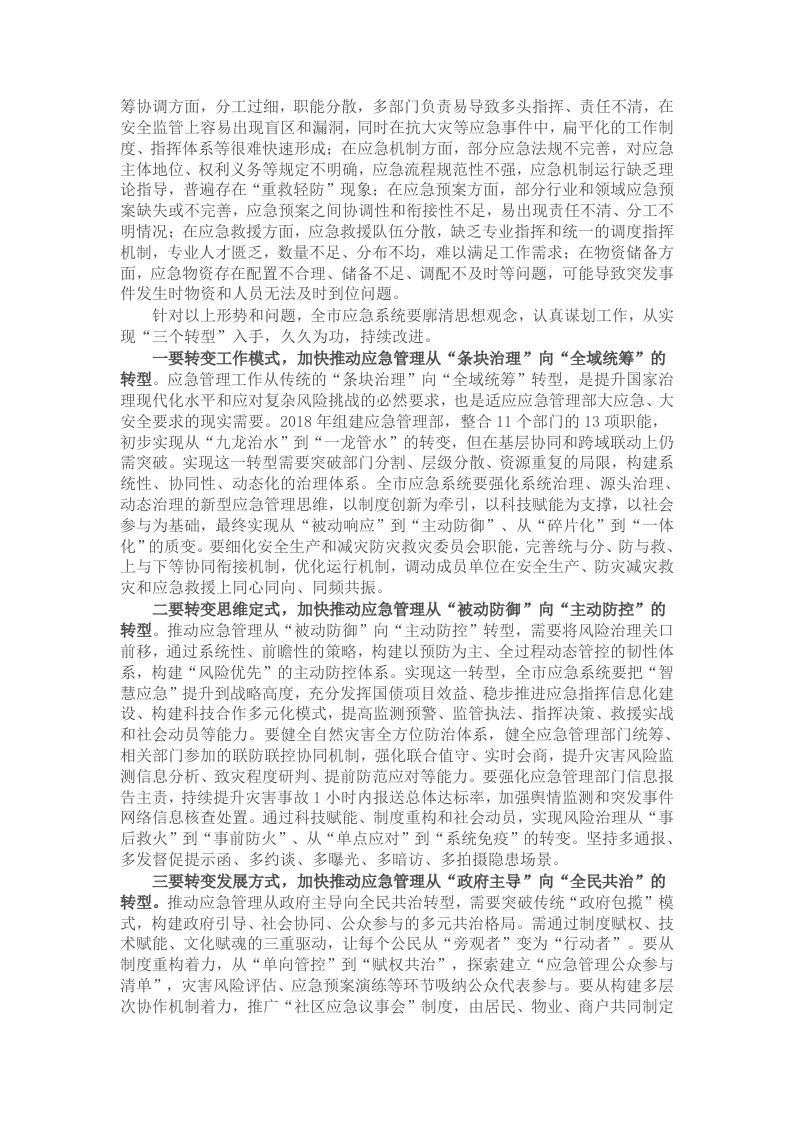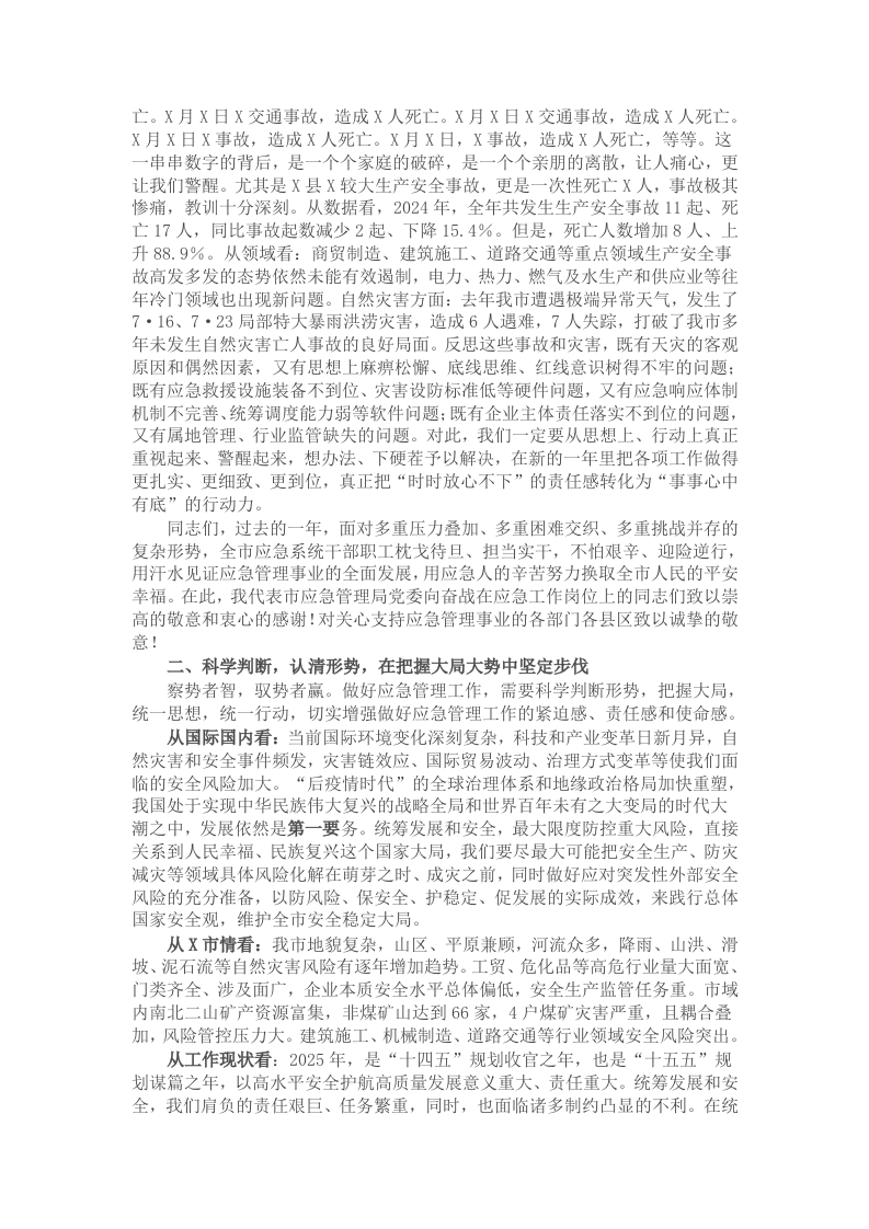 经市委市政府同意,今天我们召开2025年全市应急管理工作会议,目的是全面贯彻党的二十大、二十届三中全会精神,贯彻落实全省安全稳定工作会议全省应急管理工作会议和全省矿山安全工作会议精神,落实市委市政府工作要求,回顾总结2024年工作,全面系统谋划部署2025年工作,动员全系统凝聚共识,真抓实干,奋力推动全市应急管理工作展现新气象,迈上新台阶,取得新成效。市委常委、常务副市长X同志对这次会议高度重视,提出明确要求。刚才,*同志分别传达学习了全省应急管理工作会议、全省安全稳定工作会议、全省矿山安全工作会议和市委常委(扩大)会议精神,红生同志宣读了市长的批示,大家要认真学习领会,切实抓好落实。*分别围绕基层应急能力提升、安全生产三年治本攻坚行动、防灾减灾救灾、加强改进应急救援等工作做了表态发言,请大家互相学习借鉴。下面,我讲三点意见。一、全面总结,扬长避短,在回顾奋斗历程中凝聚力量2024年,在市委市政府的坚强领导下,全市应急管理系统认真学习贯彻习近平总书记关于应急管理工作重要指示批示精神,全面贯彻落实国务院及省市决策部署和工作要求,扛责任、盯目标、守底线、保安全、促发展,应急管理各项工作进展明显,成效很大这一年,是成效显著的一年。坚持综合统筹,协调召开全市安全生产工作会议5次,组织省市联合督导22次,开展全覆盖综合评定5次。出台《X市市级部门及中省驻宝有关单位全链条安全生产责任暂行规定》《X市部分职能交叉和新兴行业领域有关单位安全生产工作职责》,明确了部门责任,厘清了新兴行业、职能交叉领域安全监管职责,形成了上下同心、部门同频、齐抓共管的安全管理新格局。坚持督帮并举,开展“送技能进企业”活动,推进麟游县国家级煤矿安全生产重点县“摘帽”,建设完成市级煤矿安全生产监测监控平台。推进非煤矿山“四化”建设,顺利承办全省非煤矿山“四化”建设现场推进会,成功实现风县全国非煤矿山重点县“脱帽”。开展秋冬季安全生产隐患排查整治百日行动,城镇燃气、电动自行车等全链条安全整治专项行动。检查生产经营单位16373家次,排查整改各类重大事故隐患56项,一般隐患5870项。坚持项目为基,争取中省项目资金1.18亿元,加强基层防灾救援、预警指挥、航空应急能力,初步建成了市、县、镇三级应急指挥调度体系。这一年,是固本筑基的一年。坚持标本兼治,扎实推进安全生产治本攻坚三年行动,建立“1+13+33”安全生产治本攻坚总体框架,形成“10大行动+31项重点工作十89条任务清单”体系,明确“四张清单”,印发《国家行业领域重大事故隐患判定标准》,审核数据11580余条,开展调度77次,下发通报提醒函10批次,完成重大事故隐患整改889项。坚持全民共治,推动综合减灾示范县(区)和示范社区创建,扎实开展“防灾减灾日”、防灾减灾科普“五进”活动,编印《X市社区应急知识手册》5000余册,发放资料5万余份,开展科普课堂300余场,制作森林防火宣传牌90余面,进一步加强了自然灾害群策群力能救会防的体系格局。坚持升级强能,完成111部专项、部门预案编修,投入40万元支持社会救援队伍建设,争取3000多件(套)县镇救援队伍装备,完成10个直升机简易起降点建设,开展各类演练1700多场次,成功承办全省航空应急救援综合演练,受到应急部领导充分肯定。这一年,也是值得反思的一年。安全生产方面:X月X日,X事故,造成X人死亡。X月X日,X事故导致X人被困,X人死亡。X月X日,X事故,造成1人死亡。X月X日,X操作不当,造成X人死亡。X月X日X事故,造成X人死