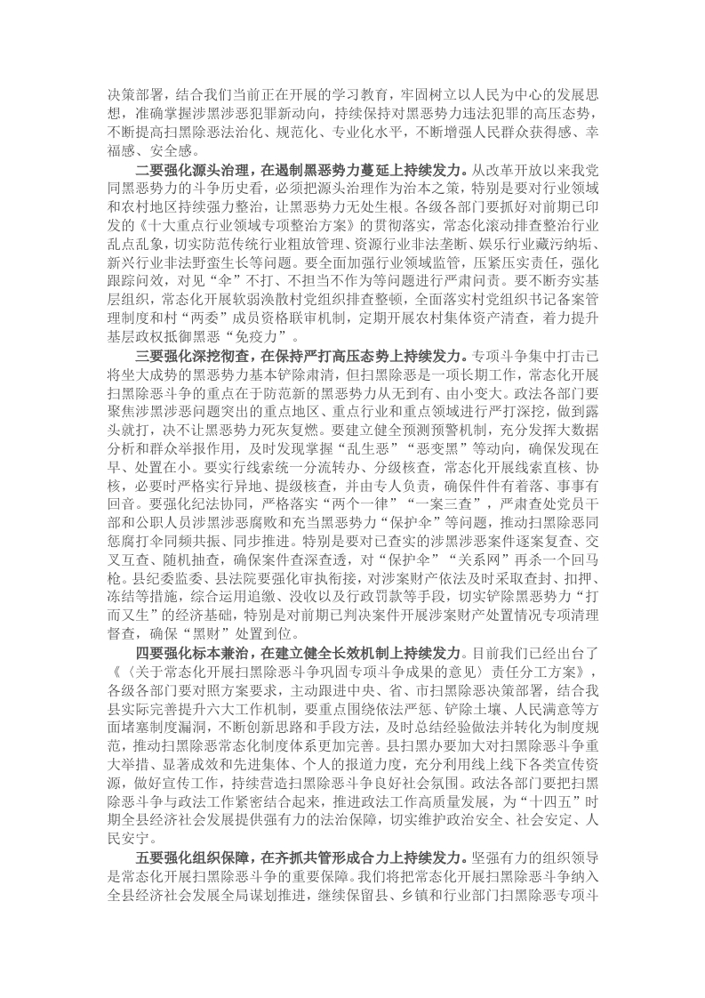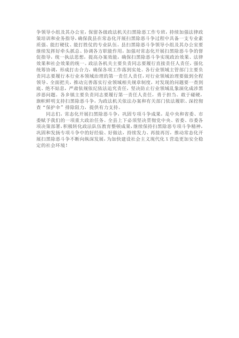 同志们:今天我们在这里召开会议,主要任务是深入学习贯彻习近平总书记关于扫黑除恶专项斗争的重要论述、习近平法治思想和全国、全省、全市扫黑除恶专项斗争总结表彰(扬)大会精神,深刻总结我县扫黑除恶专项斗争成绩,表扬全县扫黑除恶专项斗争中涌现出来的先进集体、先进个人,安排部署常态化扫黑除恶斗争工作。开展扫黑除恶专项斗争是以习近平同志为核心的党中央作出的重大决策部署。三年来,全县各级各有关部门深入贯彻习近平总书记重要指示精神,全面落实党中央和省委、市委部署要求,以最高标准、最严要求和超常规力度,打响了一场声势浩大的扫黑除恶整体战、歼灭战、人民战。高压态势全面巩固,按照“四个一”的工作模式深入开展重点地区、重点行业、重点领域专项整治,对涉黑涉恶违法犯罪坚决一查到底、除恶务尽,彻底打掉涉嫌恶势力犯罪集团X个、涉嫌恶势力犯罪团伙X个、黑社会性质组织X个,移送审查起诉聚众斗殴、寻衅滋事等九大类涉黑涉恶案件X件X人。“打伞破网”深入有效,坚持将治理党员干部涉黑涉恶问题作为重点,全面落实“一案三查”,累计查处涉黑涉恶腐败和“保护伞”案件X件X人,追责问责X人、党组织X个。基层基础持续夯实,建立村(社区)“两委”成员任职资格联审机制,从源头上把好村干部“入”的关口,累计资格联审X.X万余人次,整顿软弱涣散村(社区)党组织X个。治乱质效不断提升,全覆盖建成县、乡镇、村(社区)三级综治中心,布控“雪亮工程”野外视频监控点位XOX个、微卡口X个,慧眼工程视频监控点位X万余个,组建“红袖标”巡逻队伍X支X000余人,配置警务助理X名,专(兼)职网格员X名。社会氛围日益浓厚,充分运用“互联网+传统媒介”的手段,畅通来信、来访、电话、举报箱、网格化“五位一体”的群众举报途径,营造扫黑除恶专项斗争强大声势。推动全县社会治安秩序明显好转、政治生态明显优化、基层政权更加巩固、法治精神更加彰显、发展环境得到改善。成绩来之不易,在这里,我代表县委、县政府向受到表扬的先进集体和先进个人表示热烈的祝贺!向长期奋战在扫黑除恶一线的同志们致以诚挚问候和崇高敬意!同志们,扫黑除恶是一项长期任务,不可能一劳永逸,全县各级各部门要认清形势、正视问题,切实增强常态化开展扫黑除恶斗争的责任感和使命感,提升常态化开展扫黑除恶斗争的自觉性、认清常态化开展扫黑除恶斗争的艰巨性、增强常态化开展扫黑除恶斗争的紧迫性,提高警觉,扛起责任。下面,我就常态化开展扫黑除恶斗争强调五点意见。一要深化思想认识,在全面贯彻决策部署上持续发力。当前国际环境错综复杂,我国社会主要矛盾发生变化,黑恶势力违法犯罪组织形态、方式手段呈现新变化、新特征,有的黑恶势力隐身蛰伏、变异升级,要想彻底铲除黑恶势力,是长期且艰巨的。在X月X日全国扫黑除恶专项斗争总结表彰大会上,以习近平同志为核心的党中央对常态化开展扫黑除恶斗争提出了新的要求,强调一定要有与黑恶势力长期斗争的思想准备,切实增强常态化开展扫黑除恶斗争的政治自觉、思想自觉和行动自觉,进一步强化工作举措、健全工作机制,坚持、运用、发展好专项斗争中积累的宝贵经验,以更加有力的举措常态化开展扫黑除恶斗争,为高质量发展营造和谐稳定的社会环境。各级各部门要深刻认识到,常态化开展扫黑除恶斗争,既是巩固专项斗争成果与黑恶势力坚决斗争到底的长久之计,也是统筹发展与安全,推进国家治理体系和治理能力现代化,建设平安X的关键之举。因此,要深入贯彻党中央和省委、市委关于常态化、机制化开展扫黑除恶斗争的