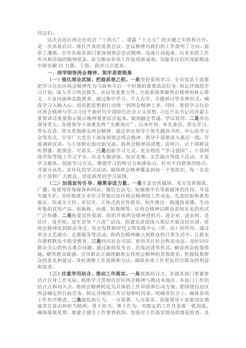 同志们:这次自治区两会在收官“十四五”、谋篇“十五五”的关键之年胜利召开,是一次承前启后、继往开来的重要会议。会议精神为我们的工作指明了方向,提供了遵循。全市各级各部门要深刻领会会议精神,迅速行动起来,以务实的工作作风和昂扬的精神状态,奋力推动各项工作取得新成效,为服务自治区闯新路进中游贡献XX力量。下面,我讲几点意见一、深学细悟两会精神,筑牢思想根基(一)强化理论武装,把稳思想之舵。一是坚持系统学习。全市党员干部要把学习自治区两会精神作为当前和今后一个时期的重要政治任务,制定详细的学习计划,深入学习两会报告、决议等重要文件,全面系统掌握两会精神的核心要义、丰富内涵和实践要求。通过集中学习、个人自学、专题研讨等多种形式,确保学习入脑入心,切实把思想和行动统一到两会精神上来。同时,要将学习自治区两会精神与学习习近平新时代中国特色社会主义思想、习近平总书记对内蒙古重要讲话重要指示批示精神紧密结合起来,做到融会贯通、学以致用。二是突出领导带头。各级领导干部要发挥“头雁效应”,以身作则、率先垂范,带头学习、带头宣讲、带头贯彻落实两会精神。通过举办领导干部专题读书班、中心组学习会等形式,引导广大党员干部深刻领会两会精神。领导干部要深入基层一线,开展调研宣讲,与干部群众面对面交流,将两会精神讲清楚、讲明白,让干部群众听得懂、能领会、可落实。三是创新学习方式。充分利用“学习强国”、干部网络学院等线上学习平台,以及专题讲座、知识竞赛、文艺演出等线下活动,丰富学习载体,创新学习方式,增强学习的吸引力和感染力。针对不同群体的特点,开展分众化、差异化的学习活动,确保两会精神覆盖到每一个党组织、每一名党员干部和广大群众,营造浓厚的学习氛围。(二)加强宣传引导,凝聚奋进力量。一是丰富宣传载体。充分发挥报纸、广播、电视等传统媒体和网站、微信公众号、短视频平台等新媒体的作用,开设专题专栏,及时报道全市学习贯彻自治区两会精神的工作动态、先进经验和典型做法,形成全方位、多层次、立体式的宣传格局。制作推出一批通俗易懂、生动形象的宣传产品,如海报、动漫、短视频等,让两会精神以群众喜闻乐见的形式广泛传播。二是拓宽宣传渠道。组织开展两会精神进机关、进企业、进农村、进社区、进学校、进军营等“六进”活动,组建宣讲团深入基层开展巡回宣讲,将两会精神送到群众身边。充分发挥新时代文明实践中心(所、站)的作用,通过举办文艺演出、志愿服务等活动,将两会精神融入到群众的日常生活中,让群众在潜移默化中接受教育。三是回应社会关切。密切关注社会舆论动态,及时回应群众关心的热点难点问题。通过新闻发布会、在线访谈等形式,解读两会政策措施,解答群众疑惑,引导群众正确理解和支持两会精神的贯彻落实。积极收集群众的意见和建议,及时调整工作思路和方法,确保各项工作更加符合群众的利益和需求。(三)注重学用结合,推动工作落实。一是找准结合点。各级各部门要紧密结合自身工作实际,找准学习贯彻自治区两会精神与推动本地区、本部门工作的结合点和切入点,将两会精神转化为具体的工作举措和行动方案。要围绕自治区两会确定的目标任务,制定详细的工作计划和时间表,明确责任分工,确保各项工作有序推进。二是强化执行力。一分部署,九分落实。各级领导干部要切实增强责任意识和担当精神,勇于担当、善于作为,对既定的工作任务要一抓到底,确保落地见效。要建立健全工作督查机制,加强对工作落实情况的督促检查,及