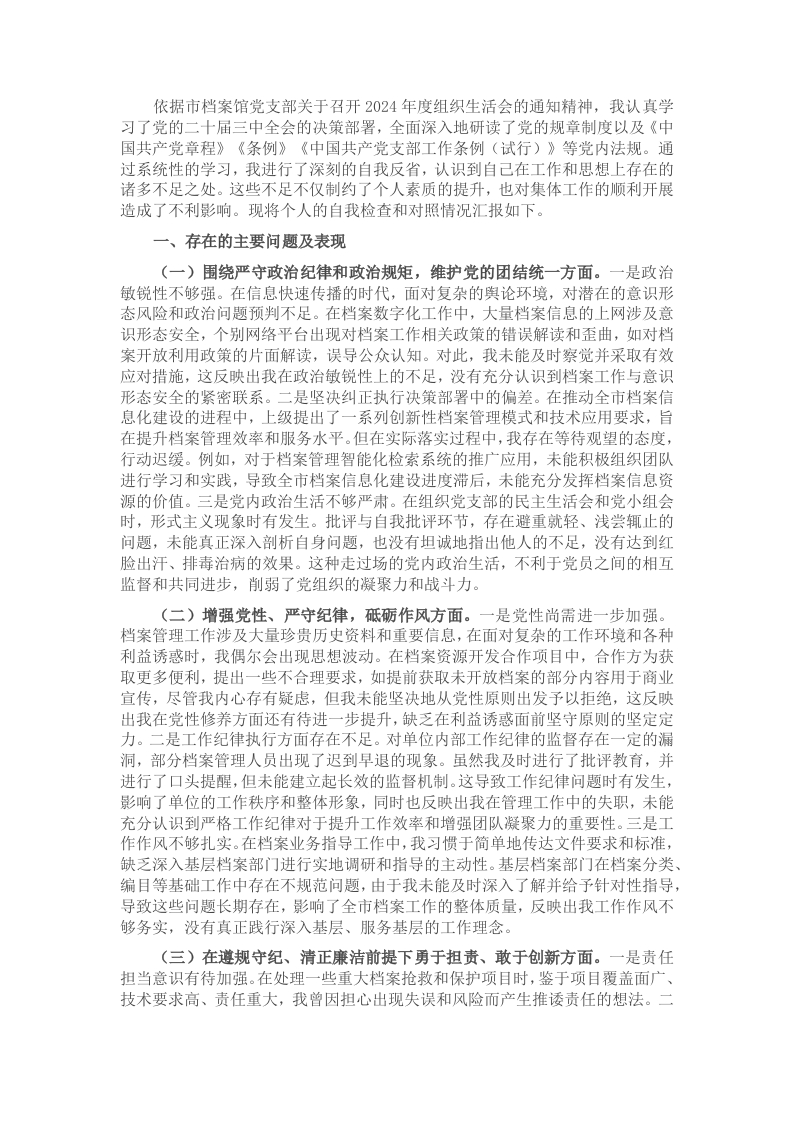 依据市档案馆党支部关于召开2024年度组织生活会的通知精神,我认真学习了党的二十届三中全会的决策部署,全面深入地研读了党的规章制度以及《中国共产党章程》《条例》《中国共产党支部工作条例(试行)》等党内法规。通过系统性的学习,我进行了深刻的自我反省,认识到自己在工作和思想上存在的诸多不足之处。这些不足不仅制约了个人素质的提升,也对集体工作的顺利开展造成了不利影响。现将个人的自我检查和对照情况汇报如下。一、存在的主要问题及表现(一)围绕严守政治纪律和政治规矩,维护党的团结统一方面。一是政治敏锐性不够强。在信息快速传播的时代,面对复杂的舆论环境,对潜在的意识形态风险和政治问题预判不足。在档案数字化工作中,大量档案信息的上网涉及意识形态安全,个别网络平台出现对档案工作相关政策的错误解读和歪曲,如对档案开放利用政策的片面解读,误导公众认知。对此,我未能及时察觉并采取有效应对措施,这反映出我在政治敏锐性上的不足,没有充分认识到档案工作与意识形态安全的紧密联系。二是坚决纠正执行决策部署中的偏差。在推动全市档案信息化建设的进程中,上级提出了一系列创新性档案管理模式和技术应用要求,旨在提升档案管理效率和服务水平。但在实际落实过程中,我存在等待观望的态度,行动迟缓。例如,对于档案管理智能化检索系统的推广应用,未能积极组织团队进行学习和实践,导致全市档案信息化建设进度滞后,未能充分发挥档案信息资源的价值。三是党内政治生活不够严肃。在组织党支部的民主生活会和党小组会时,形式主义现象时有发生。批评与自我批评环节,存在避重就轻、浅尝辄止的问题,未能真正深入剖析自身问题,也没有坦诚地指出他人的不足,没有达到红脸出汗、排毒治病的效果。这种走过场的党内政治生活,不利于党员之间的相互监督和共同进步,削弱了党组织的凝聚力和战斗力。(二)增强党性、严守纪律,砥砺作风方面。一是党性尚需进一步加强。档案管理工作涉及大量珍贵历史资料和重要信息,在面对复杂的工作环境和各种利益诱惑时,我偶尔会出现思想波动。在档案资源开发合作项目中,合作方为获取更多便利,提出一些不合理要求,如提前获取未开放档案的部分内容用于商业宣传,尽管我内心存有疑虑,但我未能坚决地从党性原则出发予以拒绝,这反映出我在党性修养方面还有待进一步提升,缺乏在利益诱惑面前坚守原则的坚定定力。二是工作纪律执行方面存在不足。对单位内部工作纪律的监督存在一定的漏洞,部分档案管理人员出现了迟到早退的现象。虽然我及时进行了批评教育,并进行了口头提醒,但未能建立起长效的监督机制。这导致工作纪律问题时有发生,影响了单位的工作秩序和整体形象,同时也反映出我在管理工作中的失职,未能充分认识到严格工作纪律对于提升工作效率和增强团队凝聚力的重要性。三是工作作风不够扎实。在档案业务指导工作中,我习惯于简单地传达文件要求和标准,缺乏深入基层档案部门进行实地调研和指导的主动性。基层档案部门在档案分类、编目等基础工作中存在不规范问题,由于我未能及时深入了解并给予针对性指导,导致这些问题长期存在,影响了全市档案工作的整体质量,反映出我工作作风不够务实,没有真正践行深入基层、服务基层的工作理念。(三)在遵规守纪、清正廉洁前提下勇于担责、敢于创新方面。一是责任担当意识有待加强。在处理一些重大档案抢救和保护项目时,鉴于项目覆盖面广、技术要求高、责任重大,我曾因担心出现失误和风险而产生推诿责任的想法。二