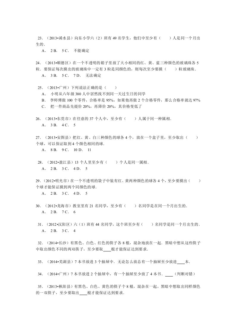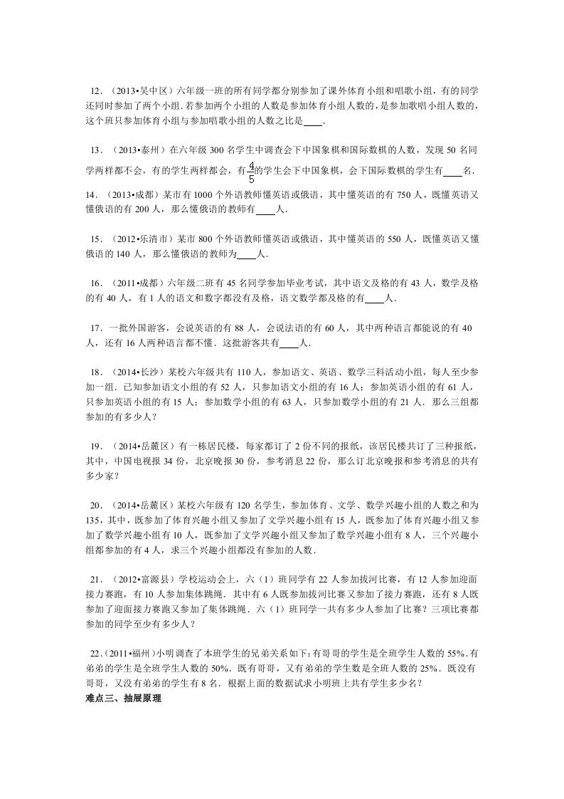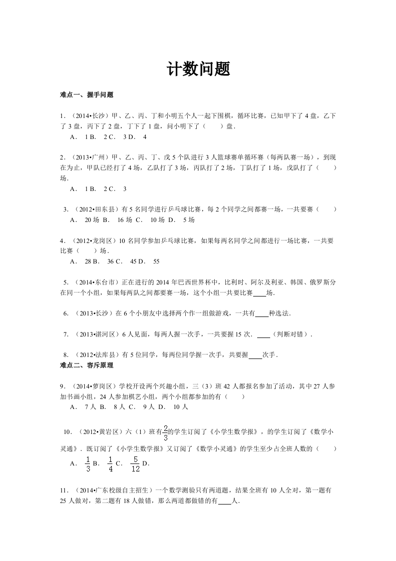 计数问题难点一、握手问题1.(2014长沙)甲、乙、丙、丁和小明五个人一起下围棋,循环比赛,已知甲下了4盘,乙下了3盘,丙下了2盘,丁下了1盘,问小明下了()盘.A.1B.2C.3D.42.(2013广州)甲、乙、丙、丁、戊5个队进行3人篮球赛单循环赛(每两队赛一场),到现在为止,甲队已经打了4场,乙队打了3场,丙队打了2场,丁队打了1场,戊队打了()场.A.1B.2C.33.(2012田东县)有5名同学进行乒乓球比赛,每2个同学之间都赛一场,一共要赛()A.20场B.16场C.10场D.5场4.(2012龙岗区)10名同学参加乒乓球比赛,如果每两名同学之间都进行一场比赛,一共要比赛()场.A.28B.36C.45D.555.(2014东台市)正在进行的2014年巴西世界杯中,比利时、阿尔及利亚、韩国、俄罗斯分在同一个小组,如果每两队之间都要赛一场,这个小组一共要比赛场.6.(2013长沙)在6个小朋友中选择两个作一组做游戏,一共有种选法.7.(2013湛河区)6人见面,每两人握一次手,一共要握15次.一(判断对错)·8.(2012法库县)有5位同学,每两位同学握一次手,共要握次手.难点二、容斥原理9.(2014萝岗区)学校开设两个兴趣小组,三(3)班42人都报名参加了活动,其中27人参加书画小组,24人参加棋艺小组,两个小组都参加的有()A.7人B.8人C.9人D.10人10.(2012黄岩区)六(1)班有2的学生订阅了《小学生数学报》,的学生订阅了《数学小灵通》·既订阅了《小学生数学报》又订阅了《数学小灵通》的学生至少占全班人数的()Ac是D11.(2014广东校级自主招生)一个数学测验只有两道题,结果全班有10人全对,第一题有25人做对,第二题有18人做错,那么两道都做错的有人.