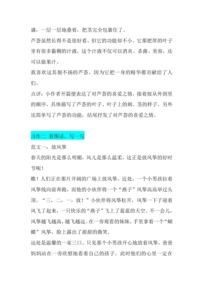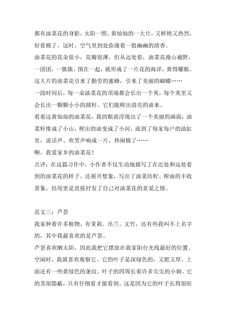 三年级下册语文第1-8单元习作范文习作一:我的植物朋友范文一:茉莉花妈妈给我买了一盆茉莉花,我把它放在阳台上。这是我拥有的第一盆属于自己的植物,我决定要好好照顾它。茉莉花的叶子是椭圆形的,碧绿碧绿的。清晨,太阳刚刚升起,叶子上滚动着亮晶晶的小水珠,在阳光下,那一片片叶子绿得发亮。再看那乳白色的花,小小的花瓣围绕着花蕊,凑成了小巧玲珑的茉莉花。你看,它正向你点头微笑呢!一阵微风吹来,淡淡的清香溢满了整间屋子。我每天放学回家后第一件事就是去看它,有时还会给它浇些水,或者把鼻子凑近花朵闻一闻它的香味。听妈妈说茉莉花晒干后还可以用来泡茶,或制成香包放在衣柜里,用处可大着呢!茉莉花啊,虽然你不是那么娇艳多姿、香气浓郁,但我却独爱你那清新淡雅的美。点评:小作者把清晨时茉莉花的叶子和花朵描写得很细致,其中比喻、拟人修辞手法的运用,更是把茉莉花写活了。另外,小作者通过视觉和嗅觉分别写出了茉莉花的样子和气味,写得真实、自然。结尾表达了小作者对茉莉花的喜爱之情,点明主题。范文二:家乡的油菜花又到了油菜花开放的季节。家乡的小路旁、山坡上、田垄里到处