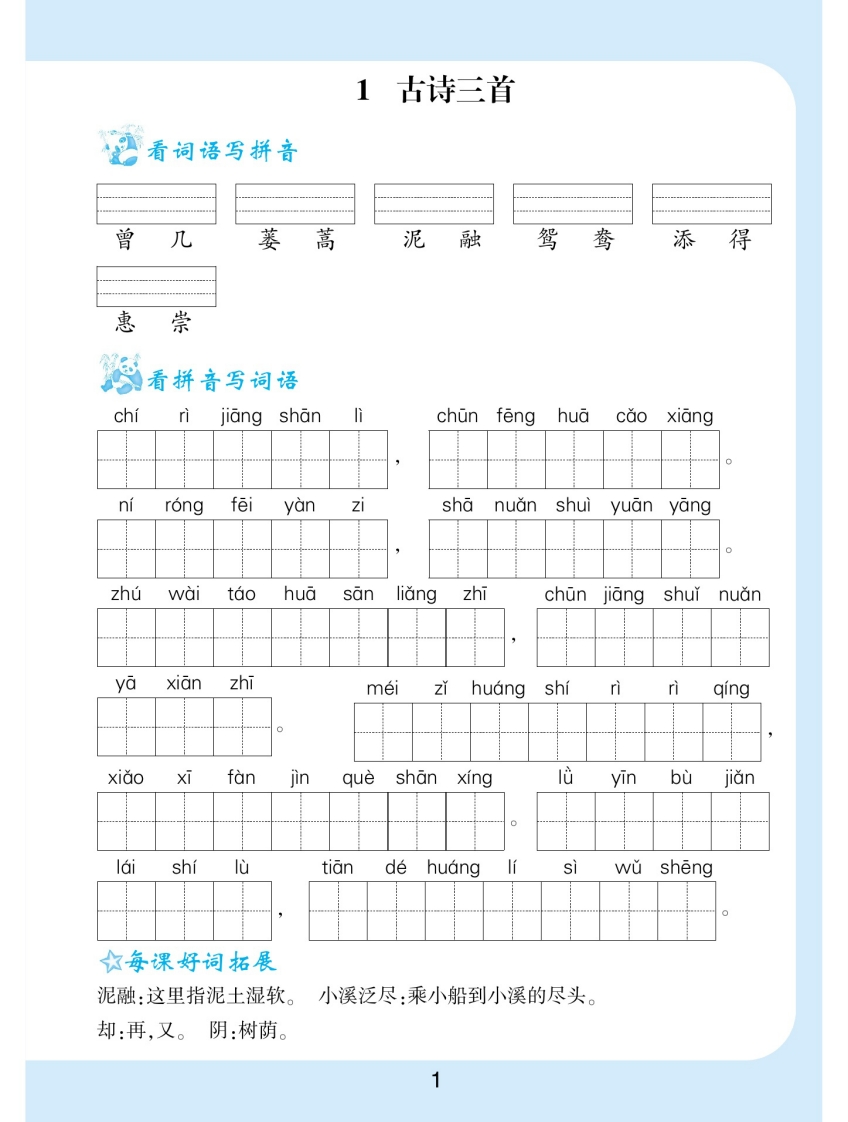 1古诗三首》看词语写拼音曾几蒌蒿泥融鸳鸯添得惠崇形看拼音写词语chijiang shanchun feng hua cao xiangnirongfeiyanzisha nuan shuiyuan yangzhúwai taohua sanliangzhichun jiang shui nuanyaxianzhimeizǐhuang sshiririgingxigoXIfaniinqueshanxinglǜyinbùjianlaishiIùtiandehuangFsiwu sheng☆每课好词拓展泥融:这里指泥土湿软。小溪泛尽:乘小船到小溪的尽头。却:再,又。阴:树荫。