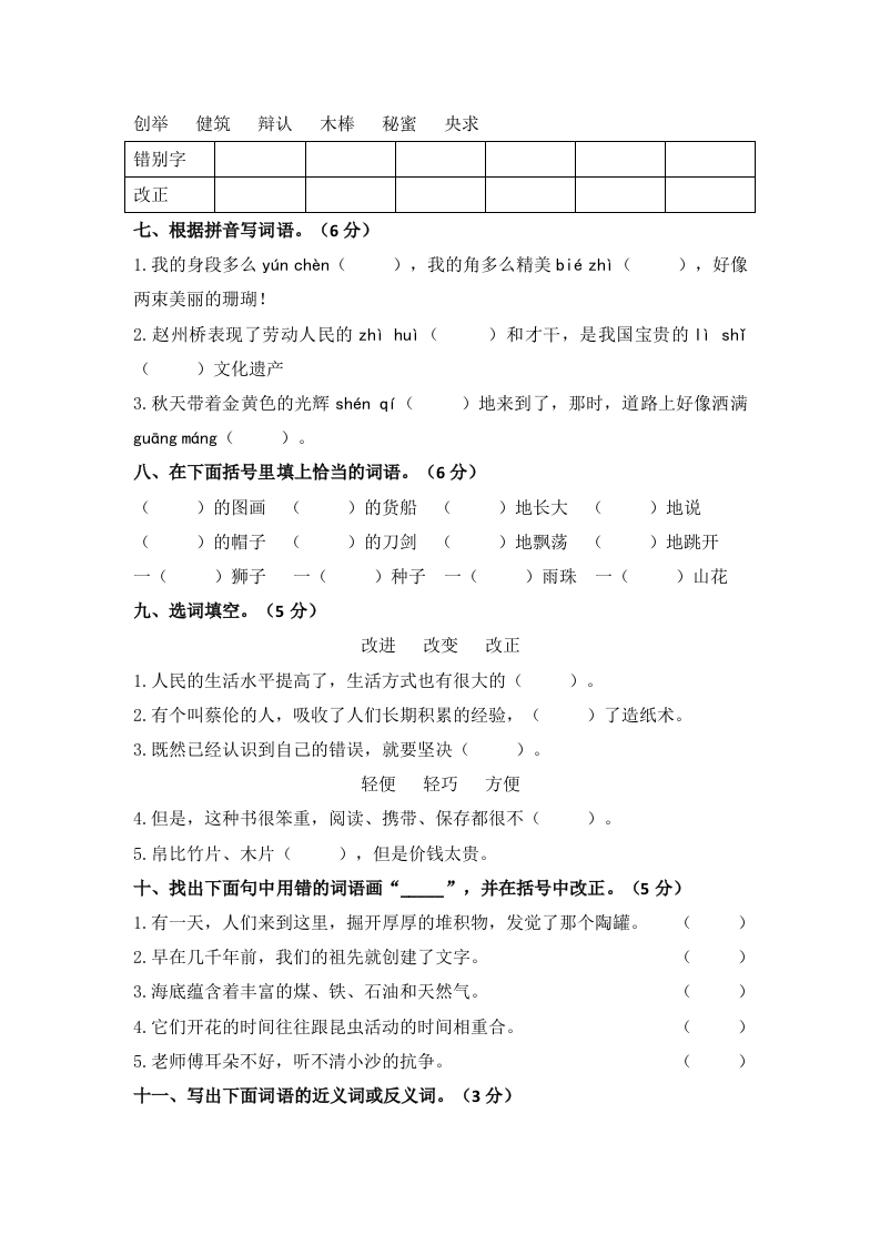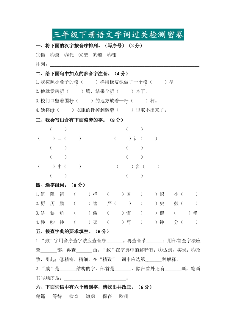 三年级下册语文字词过关检测密卷一、将下面的汉字按音序排列。(写序号)(2分)①倦②痕③代④型⑤遵⑥钳排列:二、给下面句中加点的多音字注音。(4分)1.我按照小兔子的模()样用橡皮泥做了一个模()型2.他就爱瞎折()腾,结果全折()本了。3.校门口竖着围杆()的地方放着一杆()秤。4.她将缝()衣服的针掉到砖缝()里取不出来了。三、我会写出含有下面偏旁的字。(8分)()口()讠(()()扌()纟(四、选字组词。(8分)1.组阻祖()挡)国()织小(2.厉历励()害严())史鼓()3.娇骄矫()傲)惯)健()艳4.秒吵抄()架()写()钟分(五、按查字典的要求填空。(6分)1.“致”字用音序查字法应查音序再查音节用部首查字法应查部,再查画。“致”在字典中的解释有:①达到,实现:②招致,引起;③精密,精细。在“精致”一词中应选第种解释。2.“威”是结构的字,部首是除部首外还有画,笔画书写顺序是:六、下面词语中有六个错别字,请找出并改正。(6分)莲篷等待检查谦虑保存欧州
