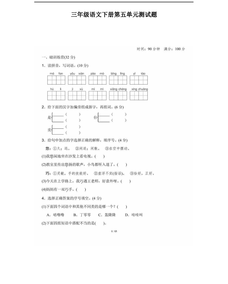 三年级语文下册第五单元测试题时间:90分钟满分:100分一、础训练营(32分)1.读拼音,写词语。(10分)ma fanyou xianpao mobing lingtaohuXUmimxiang changxing zhuang2.给下面的汉字加偏旁组成新字,再组词。(6分)是卖3.给句中加点的字选择正确的解释,填序号。(4分)悠:①久:远。②闲适:闲散。③在空中摆动。(1)我悠闲地坐在沙发上看电视。()(2)教室里传出悠扬的歌声,小鸟都听入迷了。()巧:①灵敏,手的技能好。②虚浮不实(指话)。③恰好,正好。(3)今天在上学路上,我巧遇王老师,好意外呀。()(4)妈妈有一双巧手。()4.选择正确答案的序号填空。(4分)(1)下面四个词语中和其他不同类的是哪一个?()A.咕噜噜B.丁零零C.轰隆隆D.哇哇叫(2)下面四组短语中搭配不当的是()。1/13