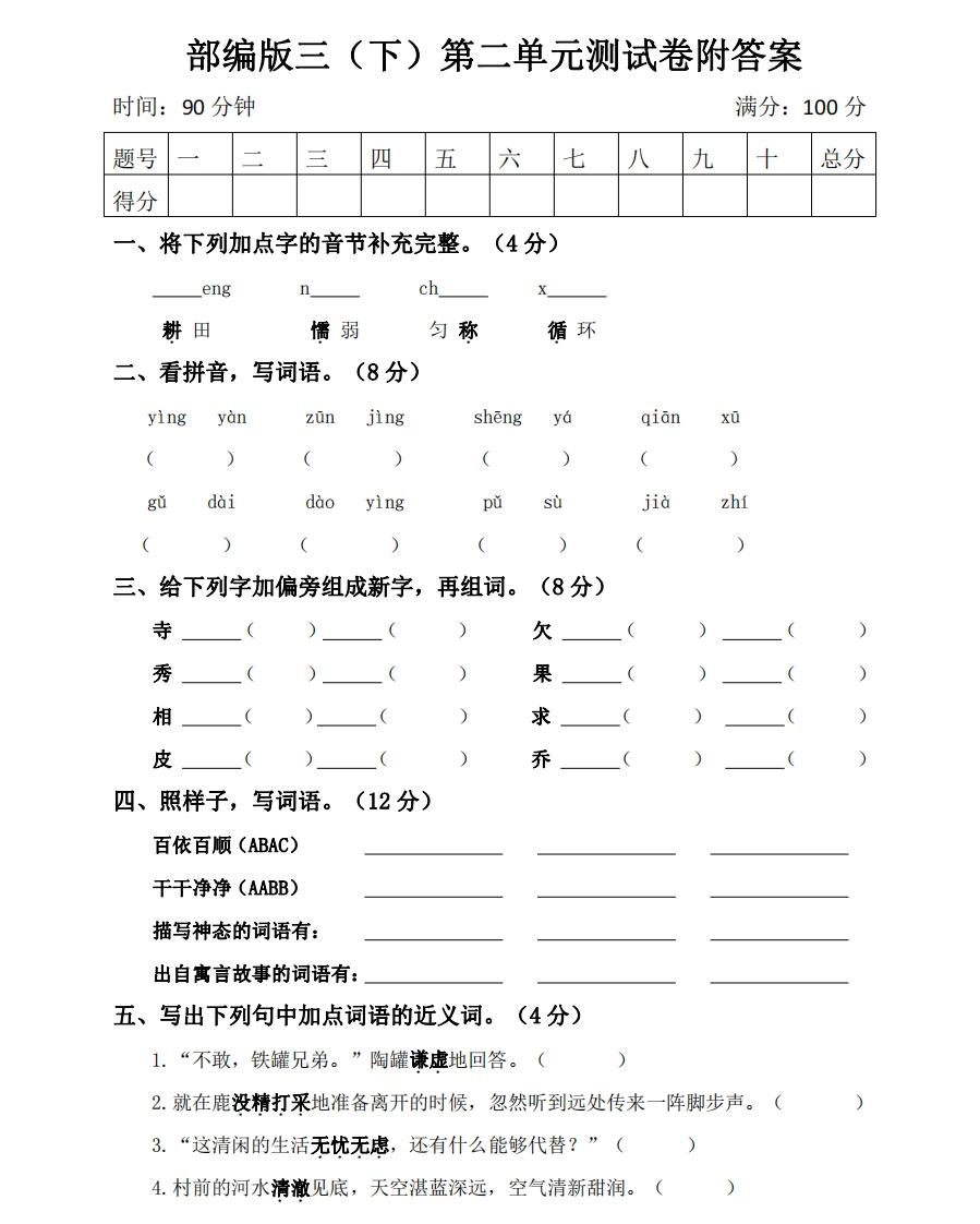 部编版三(下)第二单元测试卷附答案时间:90分钟满分:100分题号三四五六七八九总分得分一、将下列加点字的音节补充完整。(4分)engch耕田懦弱匀称循环二、看拼音,写词语。(8分)yingyanZūnjingshengyaqianXū()))()giǔdaidaoyingpusujia(((三、给下列字加偏旁组成新字,再组词。(8分)寺欠秀果相求皮乔四、照样子,写词语。(12分)百依百顺(ABAC)干干净净(AABB)描写神态的词语有:出自寓言故事的词语有:五、写出下列句中加点词语的近义词。(4分)1.“不敢,铁罐兄弟。”陶罐谦虚地回答。(2.就在鹿没精打采地准备离开的时候,忽然听到远处传来一阵脚步声。(3.“这清闲的生活无忧无虑,还有什么能够代替?”(4.村前的河水清澈见底,天空湛蓝深远,空气清新甜润。()