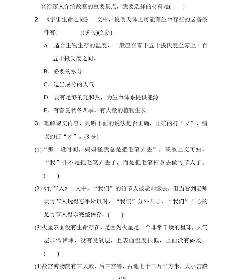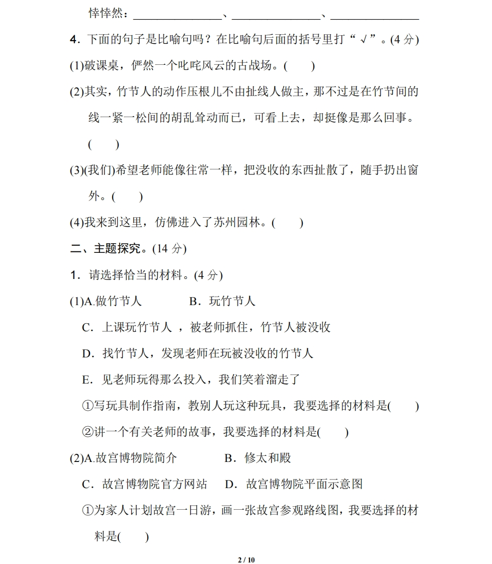 第三单元主题训练卷主题百花园(41分)一、主题达标。(25分)1.读拼音写字词。(8分)(1)wei feng lin lin()的竹节人像健美比赛中浑身gda()肉的小伙子,在他手上系上一根bing gun(棒儿,他就成了手握金箍棒的孙悟空。(2)古时候有chang e ben yue()的美丽传说,如今人们了解了宇宙的许多知识,但“地球之外是否有生命存在”这个mi(),仍等待着科学家们去jie kai((3)故宫博物院过去叫紫禁城,是明清两代的huang gong(它规模hong da(),建筑精美,布局统一,集中体现了我国古代建筑艺术的独特风格。2.在每组中不同类的词语下面画横线。(4分)(1)得意扬扬怒气冲冲念念有词虎视眈眈(2)金星水星太阳系天王星(3)太和殿乾清宫中和殿保和殿(4)仙女下凡蟠桃盛会九天揽月温室效应3.照样子写词语。(9分)轻手轻脚:津津有味:1/10