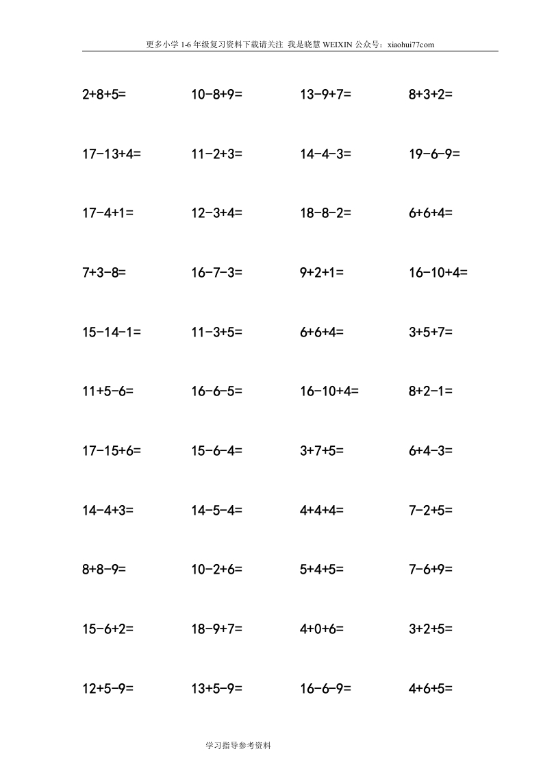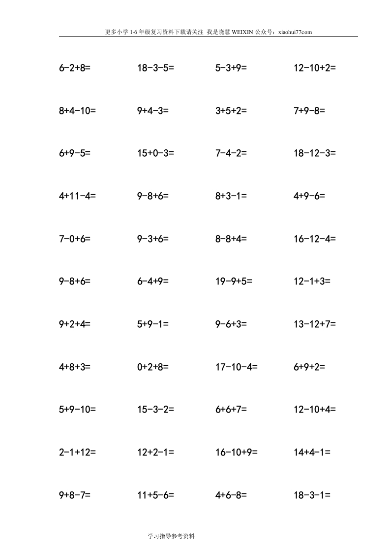 更多小学16年级复习资料下载请关注我是晓慧WEIXIN公众号:xiaohui77com2+6+2=6+10-5=8-3+8=7+8-5=5+3+2=19-4-5=9+9-7=4+1+6=4+0+3=10-8+3=8+7-5=8+8-8=10-3-7=7+8-4=6-2+7=11+7-7=9-3-65+8-3=16+2-2=8-2+8=10-1-4=2+3+7=9+4-3=19-4-4=7-2+49+7-6=11-0+7=8+6-4=8+2-67-4+7=4+1+4=16-5-1=10-4+3=8+1+6=8+6+4=9-0+5=3+6-8=11-1+5=8+9-6=4-2+9=8-7+16=7-4+8=9-1+7=14-4+1=学习指导参考资料