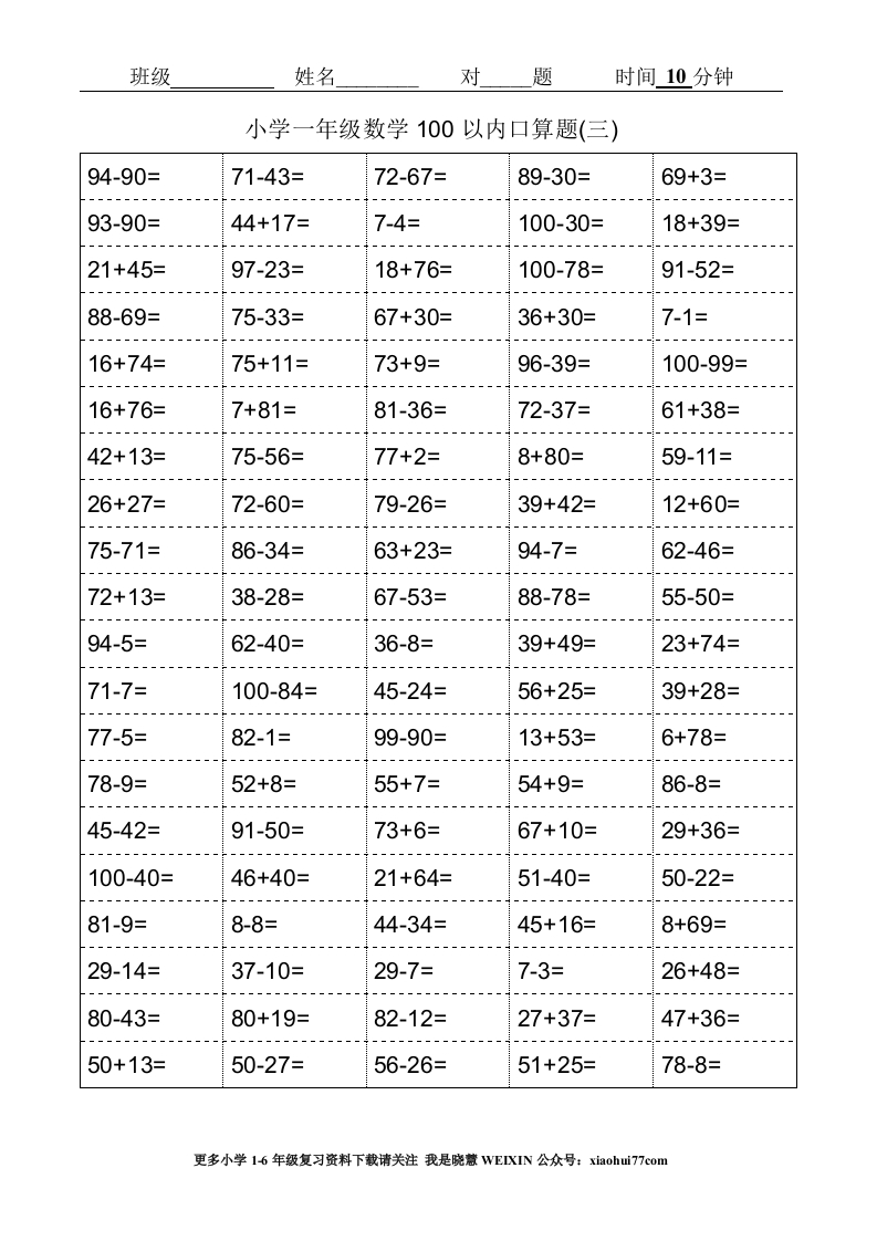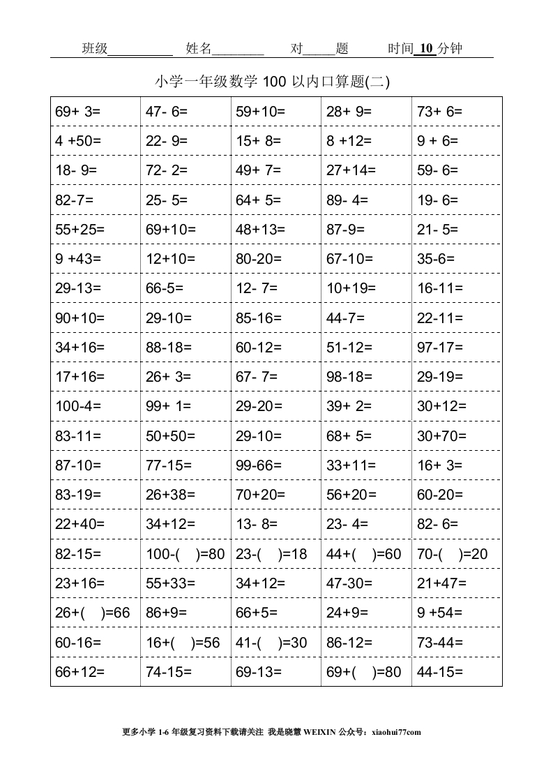 班级姓名对题时间10分钟小学一年级数学100以内口算题(一)19-10=24-6=99-20=29-8=88-70=50-50=24-13=10+20=14+25=31-11=17-7=19-12=88-80=25-4=99-23=24-13=15+14=90-10=20+8=25+33=18+11=28+2=29+1=25+25=26-10=12+5=28+2=25+8=23-3=12+10=16+8=24+4=19+11=17-12=18-8=19-6=29+10=72-10=20+30=99-98=12+10=60-40=17-17=90-40=16+54=20-10=70-50=50-30=60+30=12+33=28+6=16+40=20+44=50-50=19-18=18-15=88+12=66-16=90-30=65-25=50-20=87-7=80+9=18-13=13+17=15+53=16+6=14+22=89-80=14+26=56-40=66-20=99-30=66-46=19+60=17-())=017-14=15-3=80+4=26-16=19-()=1327-14=18+()=2014+()=2767-12=16-()=1265-33=65+25=24+24=8+()=1610+()=5065+()=70())-20=5040+())=6020+()=3087-30=16-6=80-()=075-20=30+30=更多小学16年级复习资料下载请关注我是晓藏WEIXIN公众号:xiaohui77com