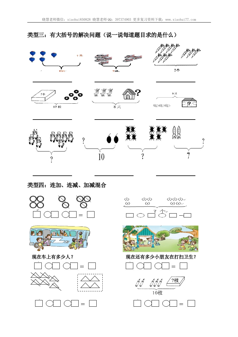 小学一年级上册-数学上册解决问题汇总xmtt884个月前发布关注私信0.99MB4页0439 第1页 / 共4页 第2页 / 共4页 第3页 / 共4页 试读已结束,还剩1页,您可下载完整版后进行离线阅读 小学一年级上册-数学上册解决问题汇总此内容为付费资源,请付费后查看¥1¥2会员服务免费立即购买您当前未登录!建议登陆后购买,可保存购买订单付费资源© 版权声明文章版权归作者所有,未经允许请勿转载。THE END数学 文本预览 晓慧老师微信:xiaohui850828晓慧老师Q:397374903更多复习资料下载:mm.xiaohui77.com一年级上册解决问题汇总姓名:类型一:看图说意思列算式△公尽公丛1当晚品1Πn类型二:一图四式图②帝翰孕8剑空o&88特例: 查看更多 收起部分 喜欢就支持一下吧点赞9 分享QQ空间微博QQ好友海报分享复制链接收藏
