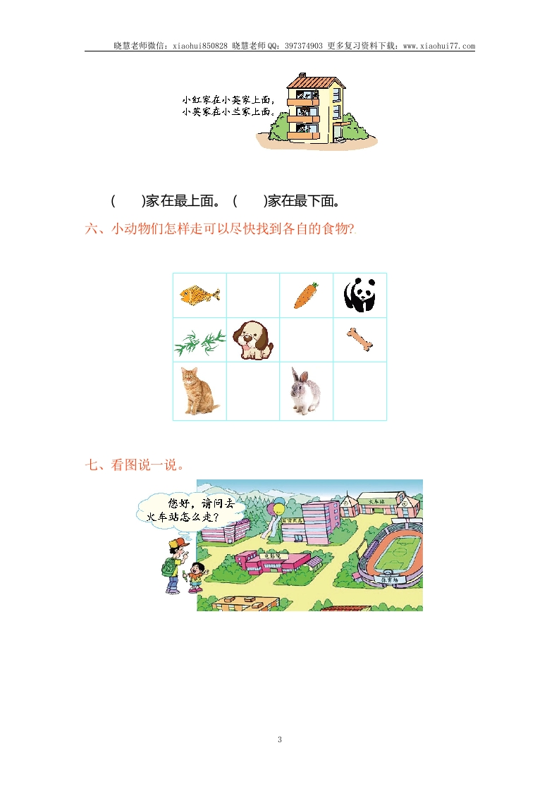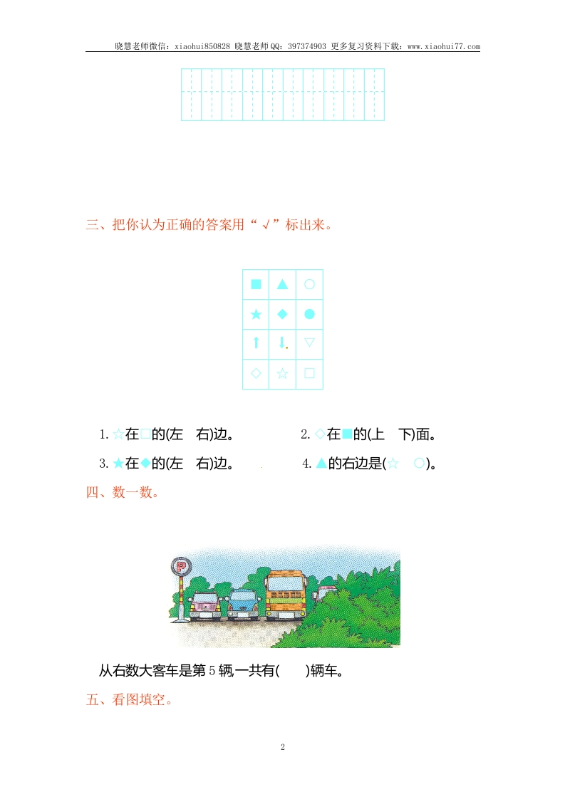 晓慧老师微信:xiaohuis850828晓慧老师Q:397374903更多复习资料下载:m.xiaohui77.com人教版数学一年级上学期第2单元测试卷1一、填空题。1.的上面是(),它的右边是():○的下面是(),它的左边是())。2.小朋友们正在玩“开火车”游戏。看图说一说。小、军小时小芳小小冬(1)小丽的前面是,后面是(2)小芳的前面是后面是(3)小军的后面有人小冬的前面有人。二、把6写在上一行,把9写在下一行。