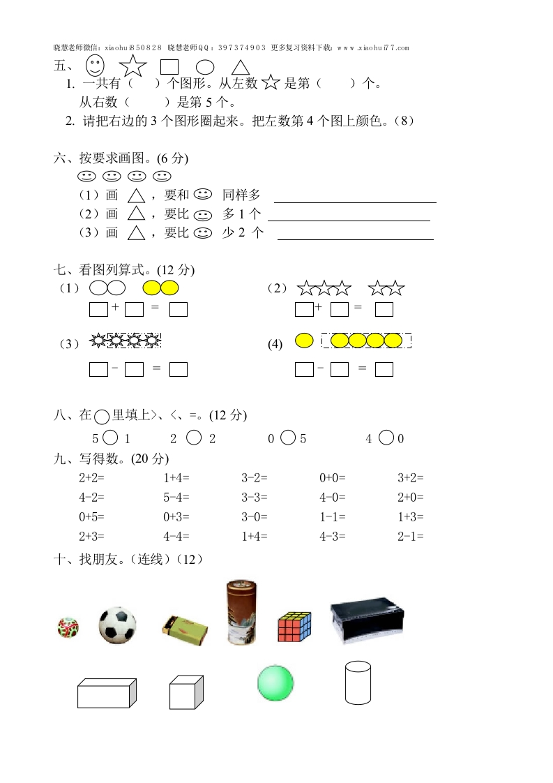 晓慧老师微信:xohu迟50828晓慧老师QQ:397374903更多复习资料下载:www xaohu77.com小学一年级数学上册九月月考试卷成绩:一、从0写到5,看谁写得认真、漂亮。(6分)二、先数一数,再连线。(8分)Sa作2花平平3带节平45中⊙69中额©摩®8®®鹿®9西金ee106666三、比一比,看谁最仔细。(12分)(1)比一比,谁多,谁少?△△△△△●●●冬☆冬古)比()多()和()同样多(2)在多的后面画(○,在少的后面画人。☆☆☆☆☆☆☆ū000000四、按顺序填数。(10分)(1)1□3□□(2)5☐☐21