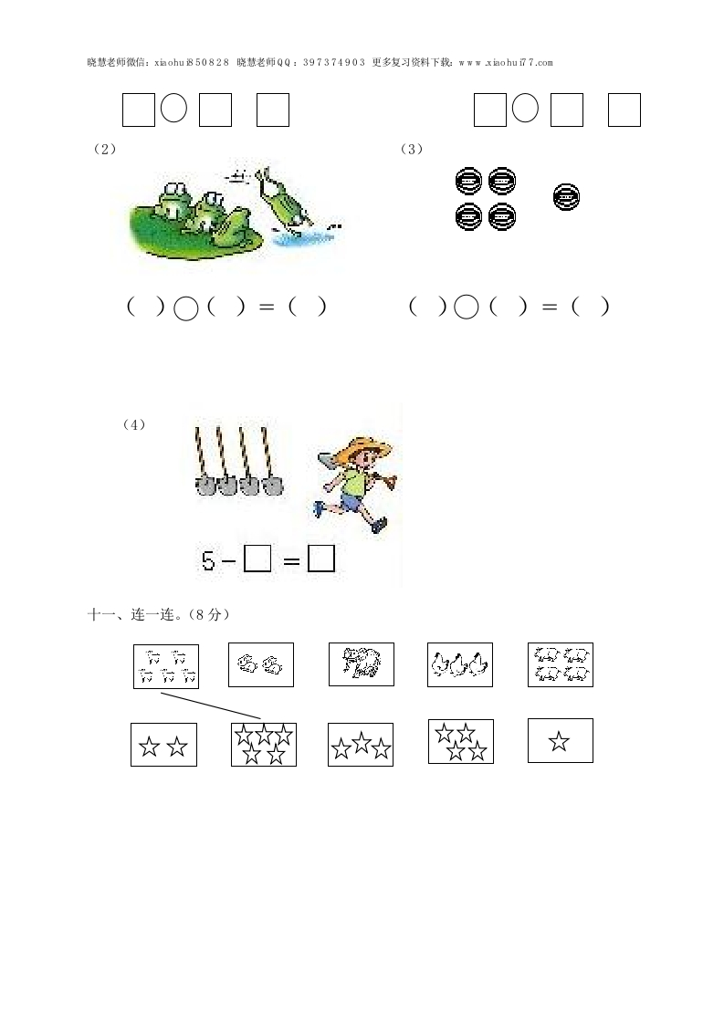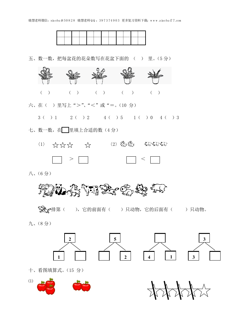 晓慧老师微信:xohu850828晓慧老师QQ:397374903更多复习资料下载:wwwxaohu77.com新人教版数学一年级上册阶段性检测试题第一二、三单元一年级数学时间:40分钟一、我会算。(20分)2+3=2-2=4-2=2+0=4-3=3+2=2+2=5-2=0+3=5-3=2-0=3-2=5-1=3+1=2-1=2+1=1+1=1+3=1+4=1-0=二、比一比。(6分)1.☆☆☆☆☆2.位堡AA恩a尊de卓a5a=O0000☆比△多个。图比r尊5比2多△比☆少个。琴比2此5少三、按要求填一填。(12分)》△⊙的上面是(),下面是()☆O在☆的()面,☆在O的()面△在口的()面,口在△的()面四、我写得最漂亮。请你按顺序在下面格子里写上0一5六个数字。(6分)