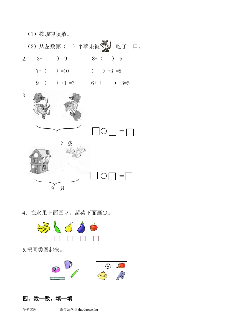 新人教版一年级数学上册第4-5单元试卷xmtt884个月前发布关注私信0.78MB4页0385 第1页 / 共4页 第2页 / 共4页 第3页 / 共4页 试读已结束,还剩1页,您可下载完整版后进行离线阅读 新人教版一年级数学上册第4-5单元试卷此内容为付费资源,请付费后查看¥1¥2会员服务免费立即购买您当前未登录!建议登陆后购买,可保存购买订单付费资源© 版权声明文章版权归作者所有,未经允许请勿转载。THE END数学 文本预览 晓慧老师微信:xohu850828晓慧老师QQ:397374903更多复习资料下载:wwwxaohui77.com新人教版一年级数学上册四、五单元测试卷总分:100分考试时间:90分座号口口题号二三四五六七八九总分深得分一、把不同的圈出来。(1)在6(2)☑9(3)(4)二、找朋友。(连线)C三、填空。…多多文库微信公众号duoduowenku 查看更多 收起部分 喜欢就支持一下吧点赞5 分享QQ空间微博QQ好友海报分享复制链接收藏