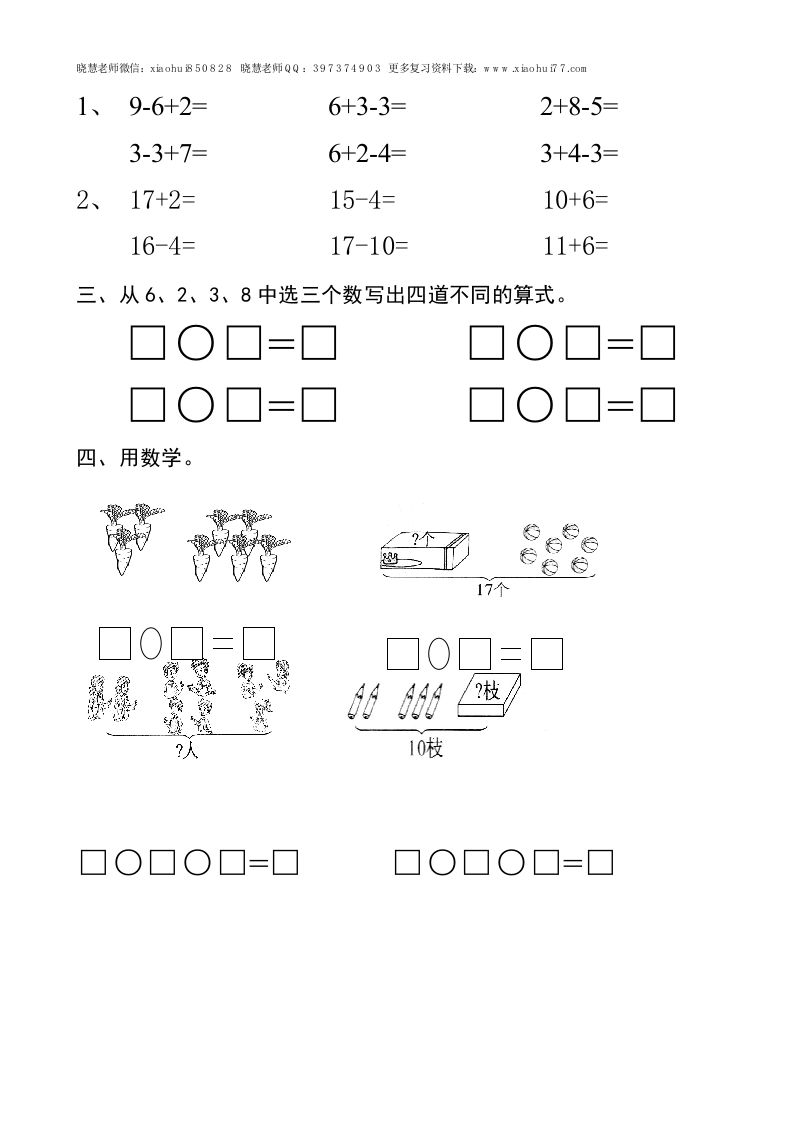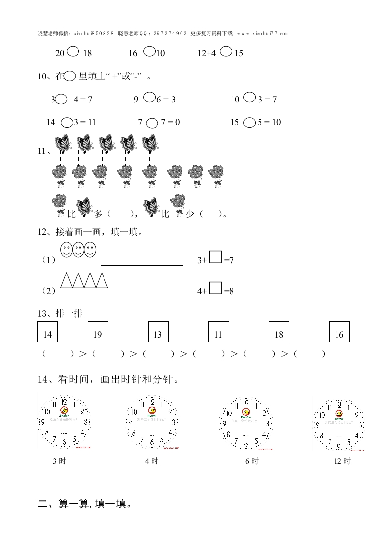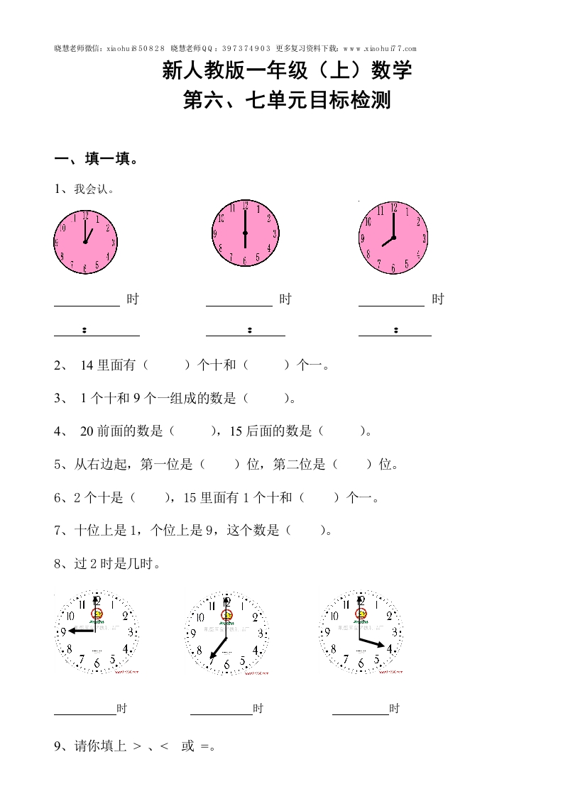 晓慧老师微信:xohu850828晓慧老师QQ:397374903更多复习资料下载wwwxaohu77.com新人教版一年级(上)数学第六、七单元目标检测一、填一填。1、我会认。355时时时2、14里面有()个十和()个一3、1个十和9个一组成的数是(4、20前面的数是(),15后面的数是()。5、从右边起,第一位是()位,第二位是()位。6、2个十是(),15里面有1个十和()个一。7、十位上是1,个位上是9,这个数是().8、过2时是几时。101010303:9B84866时时时9、请你填上>、<或=。