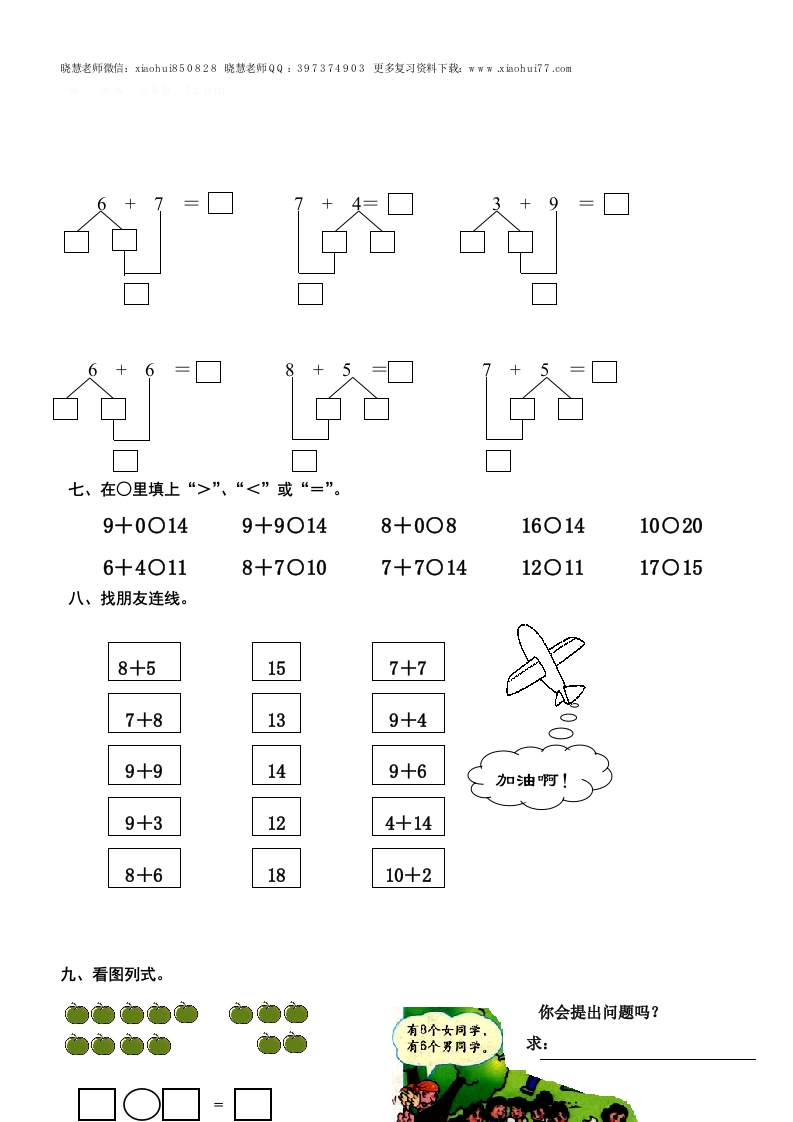 晓慧老师微信:xiaohui850828晓慧老师QQ:397374903更多复习资料下找:www xiaohui77.com一年级第六、七、八单元练习卷姓名班别学号一、我会填。1、钟面上一共有()个数字,短针是()针。2、你早上大约()时起床,晚上()时睡觉。3、一个数从右边起第一位是()位,第二位是()位。4、10的前面一个数是(),后面一个数是()。5、两个加数都是10,和是()。被减数是17,减数是7,差是()。6、20里面有()个十。二、我会选。1、()时整,时针和分针完全重合。A、3B、6C、9D、122、分针指向(),时针指向几就是几时。A、3B、10C、12D、153、11时后1小时是()时。A、8B、12C、10D、11三、过2小时是几时?33-6四、看时间,画出时针和分针。1212123时10时5时12时6时五、大约是几时?6七、按计算过程在口里填上合适的数。9+5=☐8+3=☐2+9=