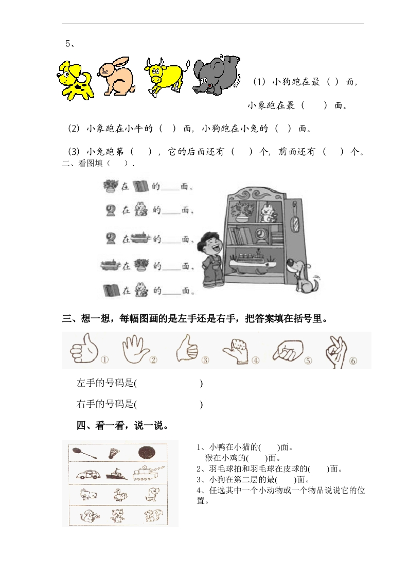 人教版一年级上册数学第二单元《位置》试卷2xmtt884个月前发布关注私信0.32MB2页0488 第1页 / 共2页 第2页 / 共2页 已完成全部阅读,共2页 人教版一年级上册数学第二单元《位置》试卷2此内容为付费资源,请付费后查看¥1¥2会员服务免费立即购买您当前未登录!建议登陆后购买,可保存购买订单付费资源© 版权声明文章版权归作者所有,未经允许请勿转载。THE END数学 文本预览 年级数学第一学期第二单元测试卷年级:姓名:分数:一、填一填。1、看图填上“前”、“后”。2、看图填上“左”、“右”。在到的边,在务的边。边,在容的边。3、1、小冬跑在最()面。2、小利跑在最()面。3、小冬在小青的()面。4、小青在小利的()面。5、小利的前面是()和(4、小朋友,我家在8号门的左边,请帮我找一找,应是第()号门。 查看更多 收起部分 喜欢就支持一下吧点赞8 分享QQ空间微博QQ好友海报分享复制链接收藏
