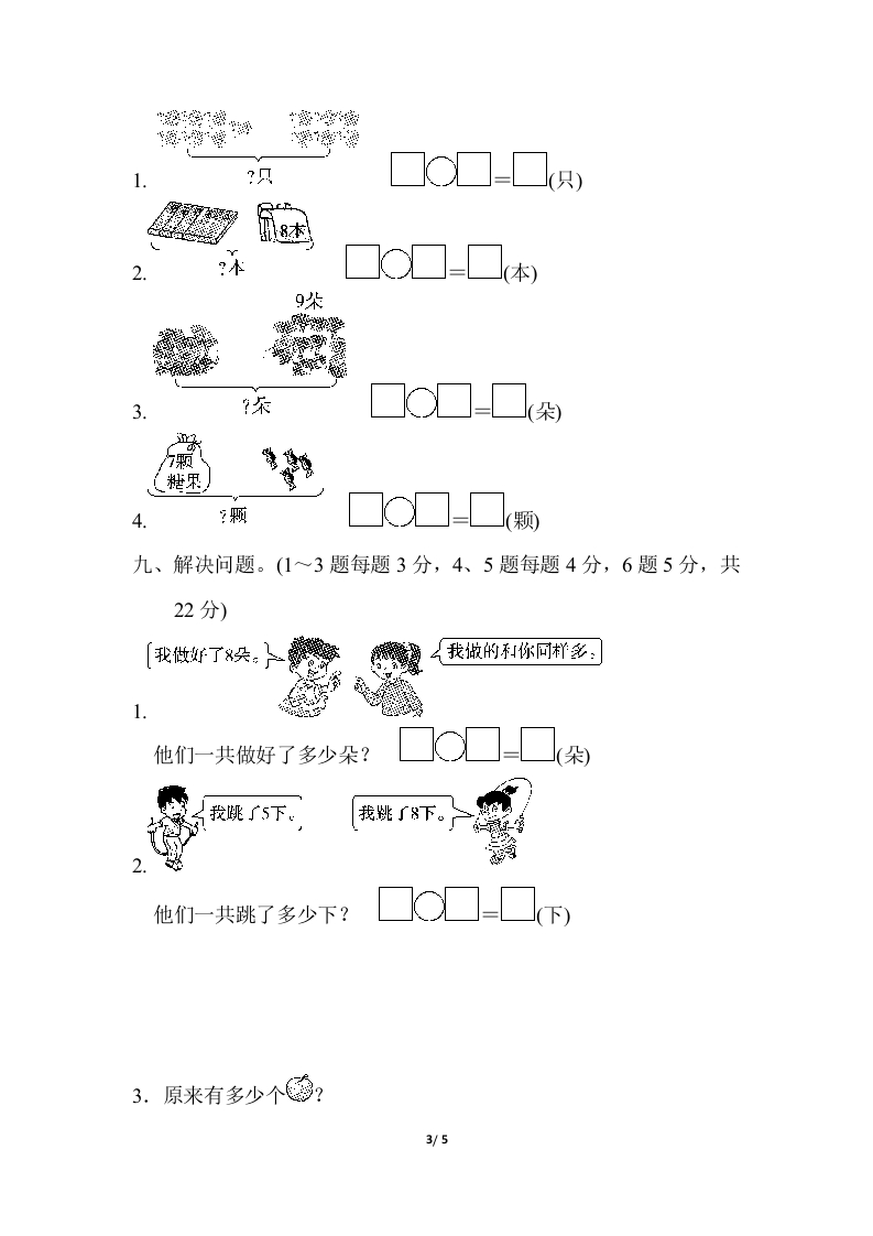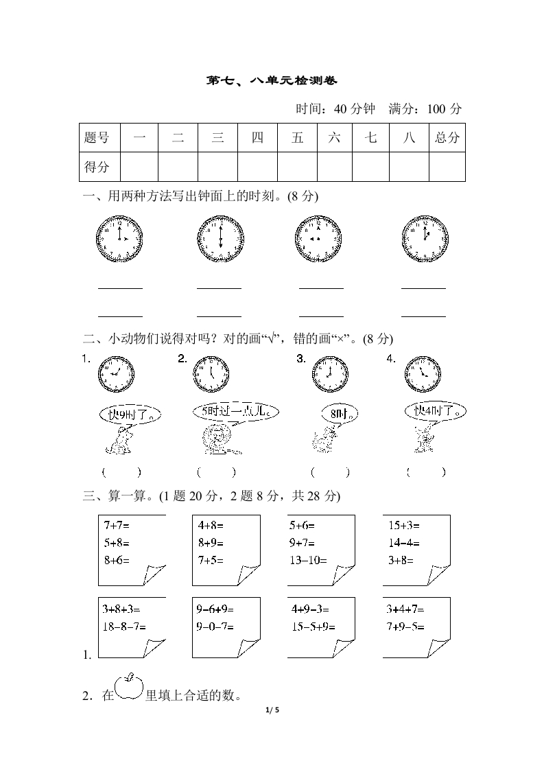 第七、八单元检测卷时间:40分钟满分:100分题号一二三四五六七八总分得分一、用两种方法写出钟面上的时刻。(8分)二、小动物们说得对吗?对的画V”,错的画“×”。(8分)23.快删了时过一点汇>8时4时了=三、算一算。(1题20分,2题8分,共28分)7+7=4+8=5+6=15+3=5+8=8+9=9+7=14-4=8+6=7+5=13-10=3+8=3+8+3=9-6+9=4+9-3=3+4+7=18-8-7=9-0-7=15-5+9=7+9-5=1.2.在里填上合适的数。1/5