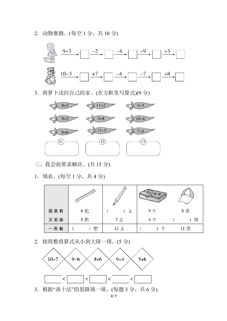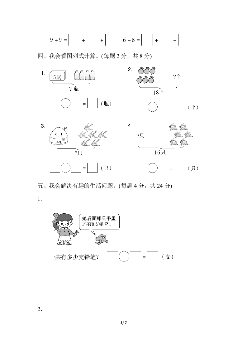 8单元跟踪检测卷一、我会填。(3题4分,其余每空1分,共16分)1.3+()=128+()=156+()=147+()=13()+4=11()十9=172.在里填上“><”或“=”。6+916143+88+9157+71611○4+916-55+63.685-27+7=18-5=二、计算大闯关。(共37分)1.细心夺红旗。(每题1分,共18分)7+9=9+2=8+9=6+9=8+5=9+4=7+5=6+6=8+8=7+7=8+3=6+8=4+7=9+6=7+3+8=9+3+4=8+4+4=6+5+7=1y7