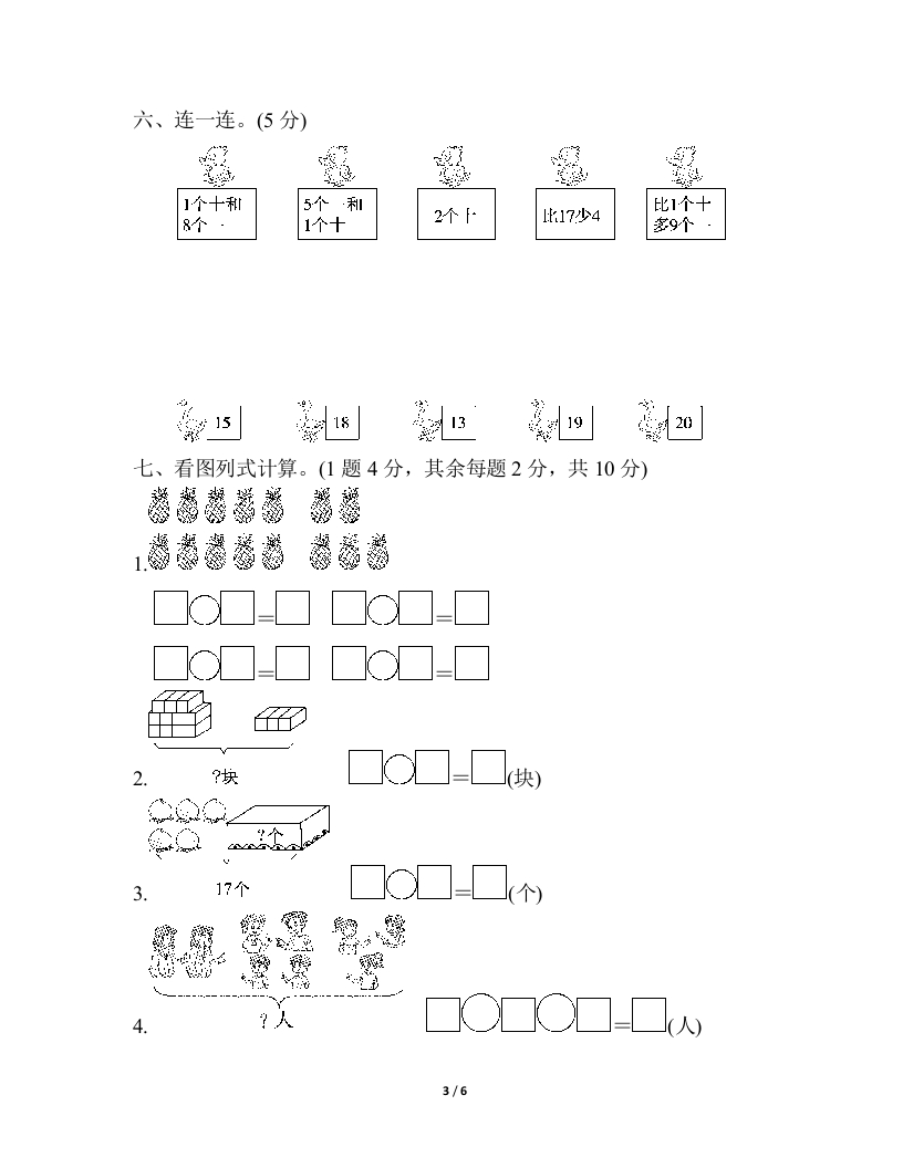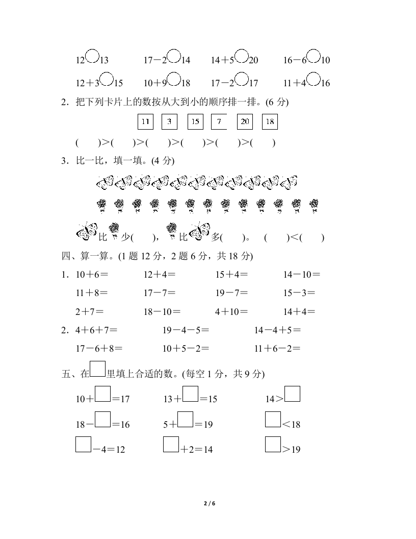第六单元检测卷时间:40分钟满分:100分题号二三四五六七八总分得分一、填一填,圈一圈。(6题3分,其余每空1分,共16分)1.16的个位是(),十位是()2.和19相邻的两个数是()和()。3.16由()个十和()个一组成,它后面的一个数是()o4.20里面有()个一,()个十是20。5.看图写数。曾10个y型紼联中位个园6.一共有()只小猴,把左边的五只小猴圈起来,从右边数,把第4只圈起来。8浪容务净速二、我会画一画。(8分)十位个位十位个位十位个位十位个守17201512三、比一比,排一排。(18分)1.在里填上>%<”或“=”。(每空1分,共8分)1/6