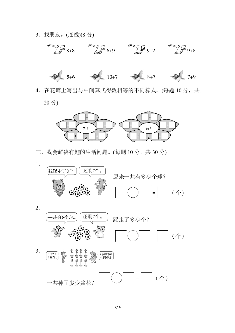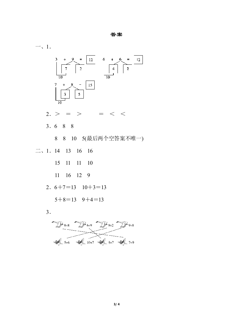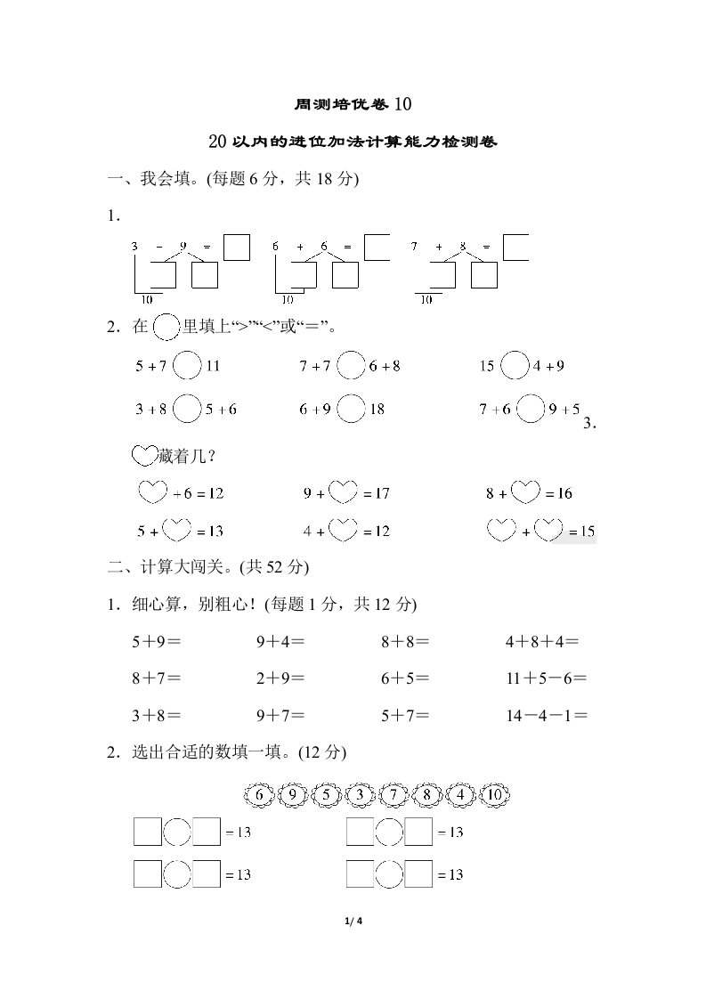 周测培优卷1020以内的进位加法计算能力检测卷一、我会填。(每题6分,共18分)1.2.在(里填上“%<”或“=”。5+7○117+7(6+8()4+9153+8()5+66+9()187+6○9+53.○藏着几?+6=129+=178+○=165+>=134+>=12(+)=15二、计算大闯关。(共52分)1.细心算,别粗心!(每题1分,共12分)5+9=9+4=8+8=4+8+4=8+7=2+9=6+5=11+5-6=3+8=9+7=5+7=14-4-1=2.选出合适的数填一填。(12分)69③7840213○☐-3=13○=131/4