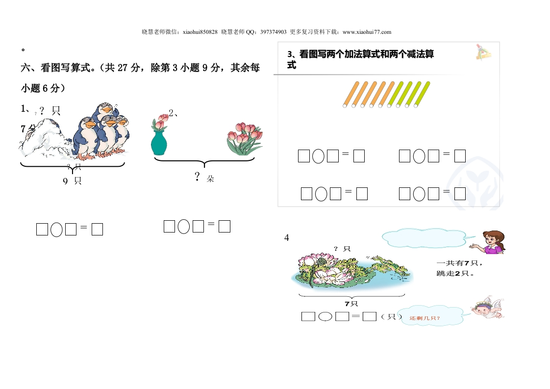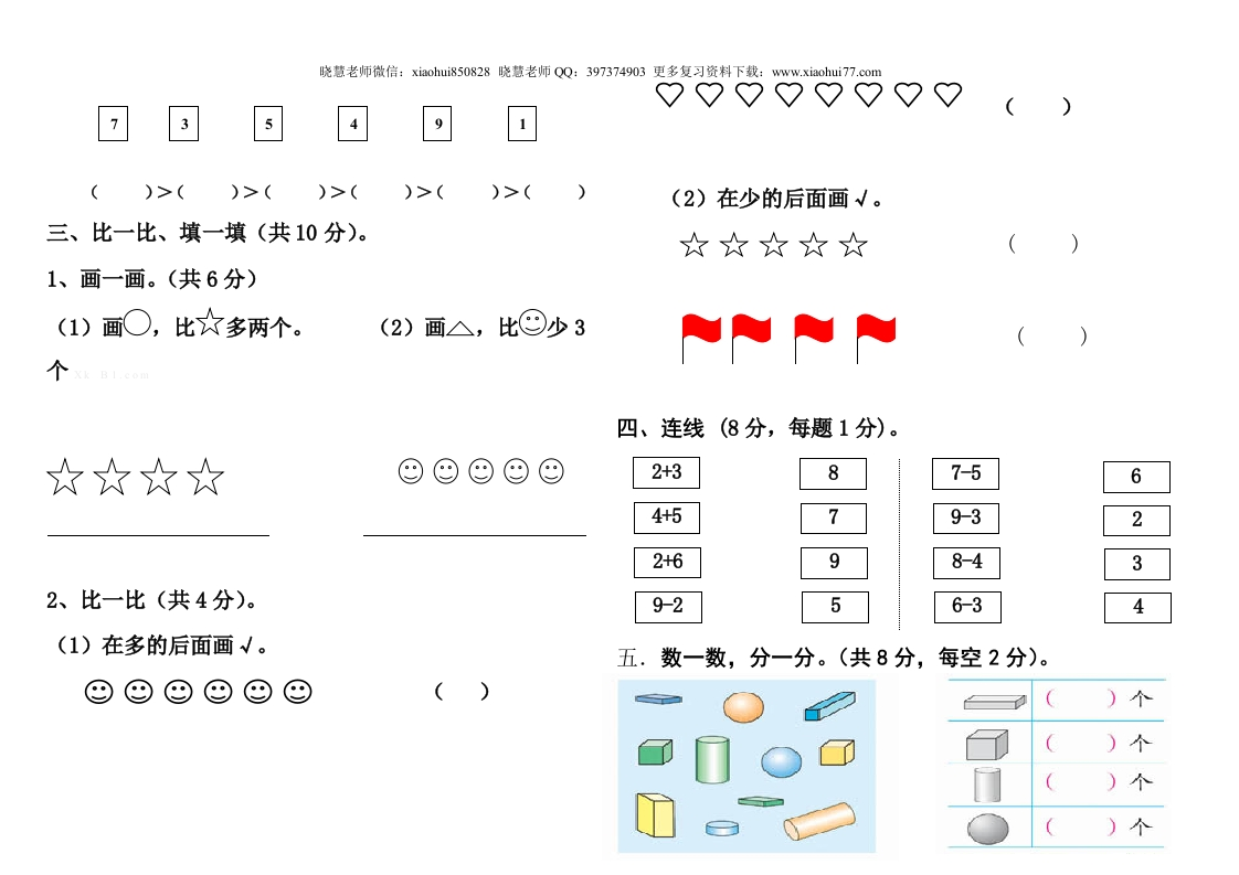 晓慧老师微信:xiaohuis850828晓慧老师QQ:397374903更多复习资料下载:www.xiaohui77.com2019-2020年度一年级数学上册期中试卷3、数一数(共5分,每空1分)。(90分钟满分100分)姓名一一班级一一分数一一一、口算。(共12分,每题1分)。7-3=4+3=3-2=5-5=(1)一共有()只小动物,(2)从左数1+4=6-0=4+5=6+2=,排第4,0十4=9-6=6-4=3-2=(3)前面有()只小动物,面有()二、按要求填空。(共35分)只小动物。1.(共12分每空3分)(4)从右边起圈出3只小动物。94、在O里填上<、>或=(共6分,每空1分)。6098-0004○2+12、按顺序填数(共6分,每空1分)。7087○1+67+2○6695、排一排(共6分,每空1分)。
