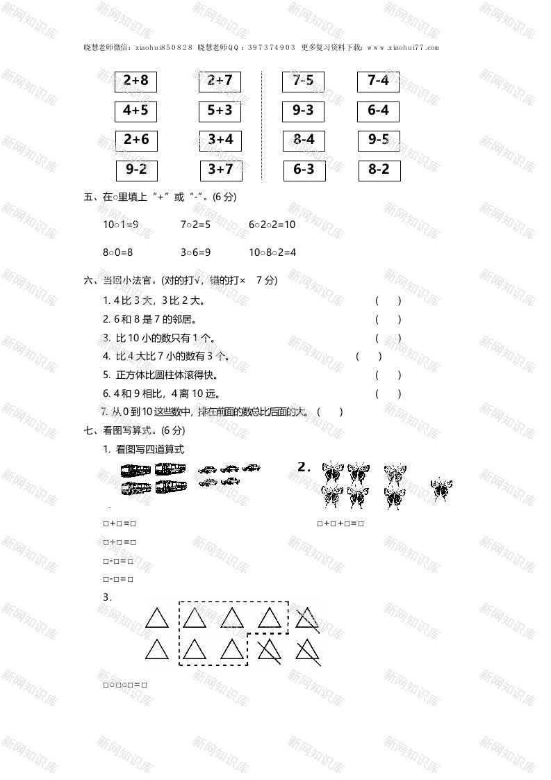 尧慧老师微信:xohu850828晓慧老师QQ:397374903更多复习资料下找www xiaohui77.com人教版小学数学第一册期中测试题p07-、口算(7+12=19分)9-5=2+8=2+6=5+3=7+3=4+6=10-7=8-4=6+3=阳4+5=9-7=10-8=8-0=10-5=9-6=8-6+5=10-3-4=5+3-6=:3-3+6=7-3+5=8-2-4=2+()=6()+()=()(()=()3+()=73+()=93+()=8二、在o里填上”>”、”<”或”=”。(6分)7+3085+4072+705+3热4-2069-3065+3o9+0三、填空(14分)1.和9相邻的两个数是()和()。2.6和8中间的数是(3.从1数到10,有(个数,7是第(个数,第4个数是()。4.在o里填上适当的数。7>口5=口口<35.把8、2、0、7、1、4、10、9这些数按从大到小的顺序排列起来。(2分)口>口>口>口>口>口>口>口6.3和6相比,(比8小得多。7.5的右边是(),左边是()。四、连线(8分)