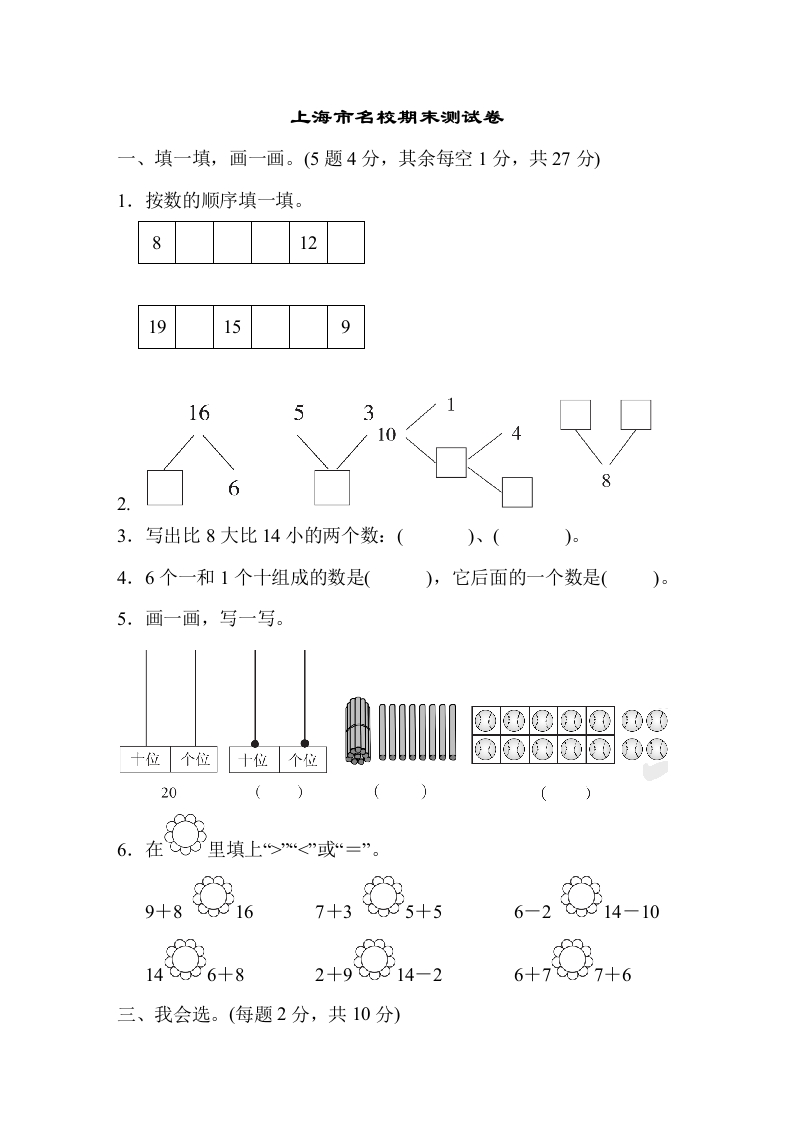 上海市名校期末测斌卷一、填一填,画一画。(5题4分,其余每空1分,共27分)1.按数的顺序填一填。8121915916531063.写出比8大比14小的两个数:()、0)e4.6个一和1个十组成的数是(),它后面的一个数是()5.画一画,写一写。CCCCC十位个位十位个位®d®EedE206.在8里填上“><”或“=”。9+85167+3+56-24-106+8224-6,,+6三、我会选。(每题2分,共10分)