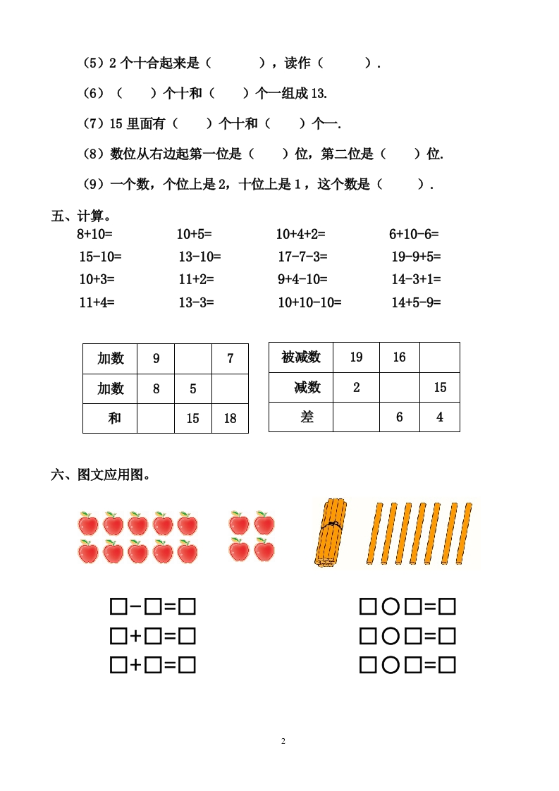 人教版一年级数学上册期末测试卷班别姓名学号156919203114(1)一共有()张卡片,有()个一位数,有()个两位数(2)从左数第4张卡片是(),它的右边有()张卡片.(3)从右数第6张卡片是(),它的左边有()张卡片.(④从左往右数,第二个数是(),第()个是11.(5)把从左数的第3张和第4张卡片圈起来,它们加起来等于()(6)最大的数是(),最小的数是()(7)把上面的数按从大到小的顺序排列二、写出下面各数。十三()十七()九()二十()三、看图写数。十位个位十位个位十位个位十位个位读作:读作:读作:读作:四、填空。(1)1个十和6个一合起来是(),个位上的数是(),十位上的数是()(2)一个数,十位上是1,个位上是6,这个数是((3)1个十和9个一合起来是(),读作((4)8个一和1个十合起来是(),读作(