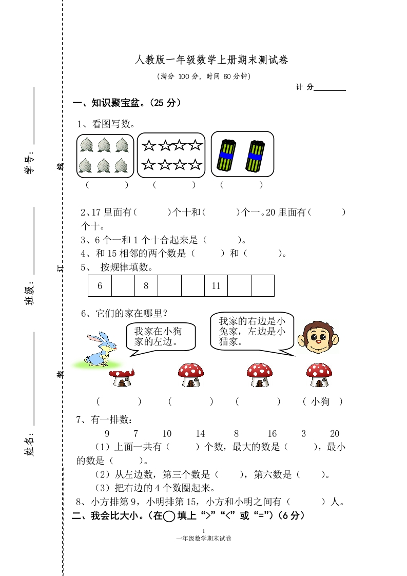 人教版一年级数学上册期末测试卷(满分100分,时间60分钟)计分一、知识聚宝盆。(25分)1、看图写数。☆☆☆☆pF☆☆☆☆2、17里面有()个十和()个一。20里面有(个十。3、6个一和1个十合起来是()4、和15相邻的两个数是()和()。片5、按规律填数。68116、它们的家在哪里?我家的右边是小我家在小狗兔家,左边是小家的左边。猫家。(小狗)7、有一排数:971014816320中(1)上面一共有()个数,最大的数是(),最小的数是()。(2)从左边数,第三个数是(),第六数是((3)把右边的4个数圈起来8、小方排第9,小明排第15,小方和小明之间有()人。二、我会比大小。(在○填上“>”“<”或“="”)(6分)一年级数学期末试卷