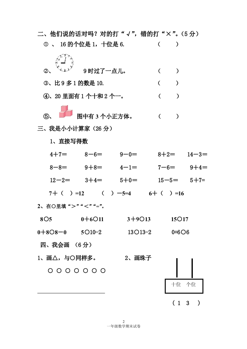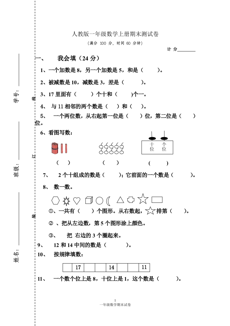 人教版一年级数学上册期末测试卷(满分100分,时间60分钟)计分我会填(24分)一个加数是8,另一个加数是5,和是()。2、被减数是10,减数是3,差是()p3、17里面有()个十和()个一。智4、与11相邻的两个数是()和()。5、一个两位数,从右起第一位是()位,第二位是()位。6、看图写数:8铭片(蜜7、2个十组成的数是();它前面的一个数是()。8、数一数。染口了0(△中☆☐①、一共有()个图形。从右数起,人排第()䵁②、把从左边数,第5个图形涂上颜色。③、把右边的3个圈起来。9、12和14中间的数是(10、按规律填数:製17141111、一个数个位上是8,十位上是1,这个数是()。一年级数学期末试卷