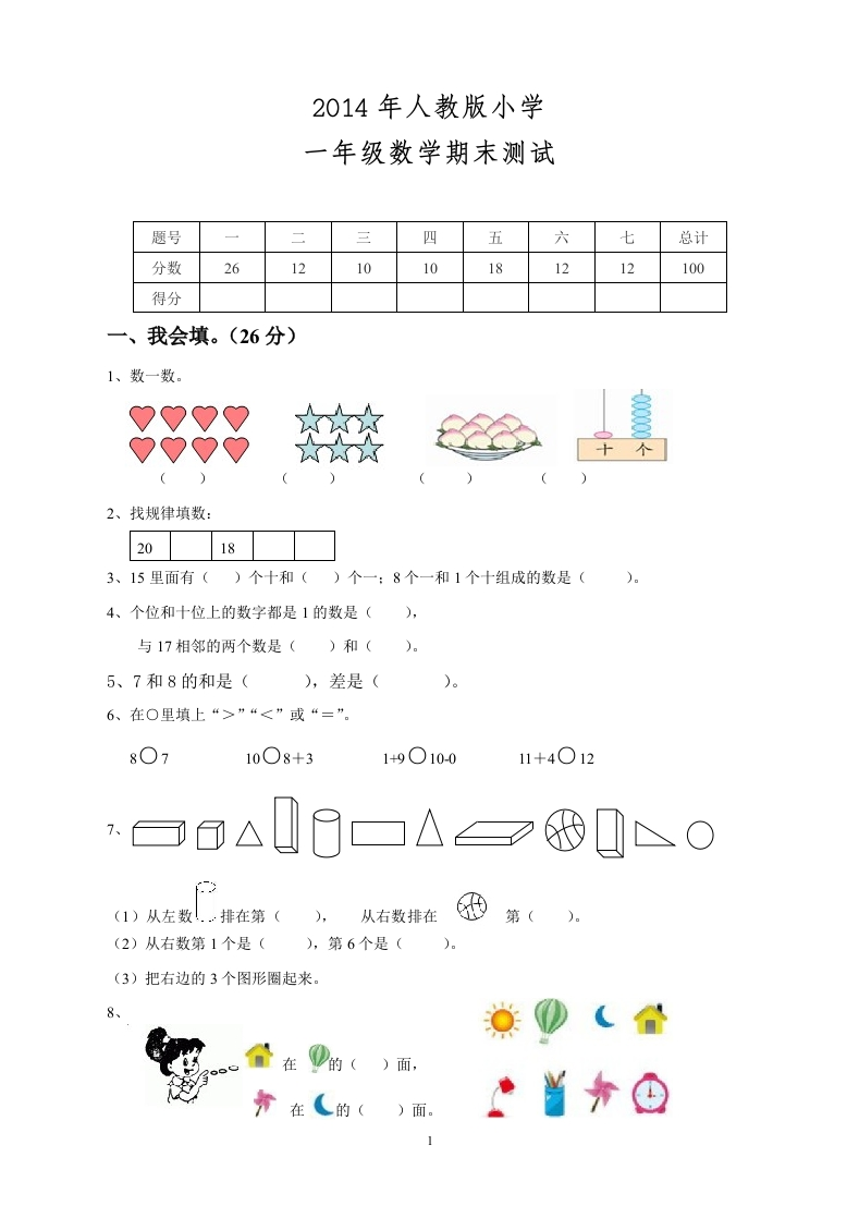 2014年人教版小学一年级数学期未测试题号二三四五六七总计分数26121010181212100得分一、我会填。(26分)1、数一数99982、找规律填数:20183、15里面有()个十和()个一:8个一和1个十组成的数是()。4、个位和十位上的数字都是1的数是(),与17相邻的两个数是()和()。5、7和8的和是(),差是()。6、在O里填上“>”“<”或“=”。8○710○8+31+9○10-011+4○12白0△0日口△=2城0N0(1)从左数.…排在第(从右数排在第((2)从右数第1个是(),第6个是((3)把右边的3个图形圈起来。8⑩(6}在D的()面,在(的()面◆当书@