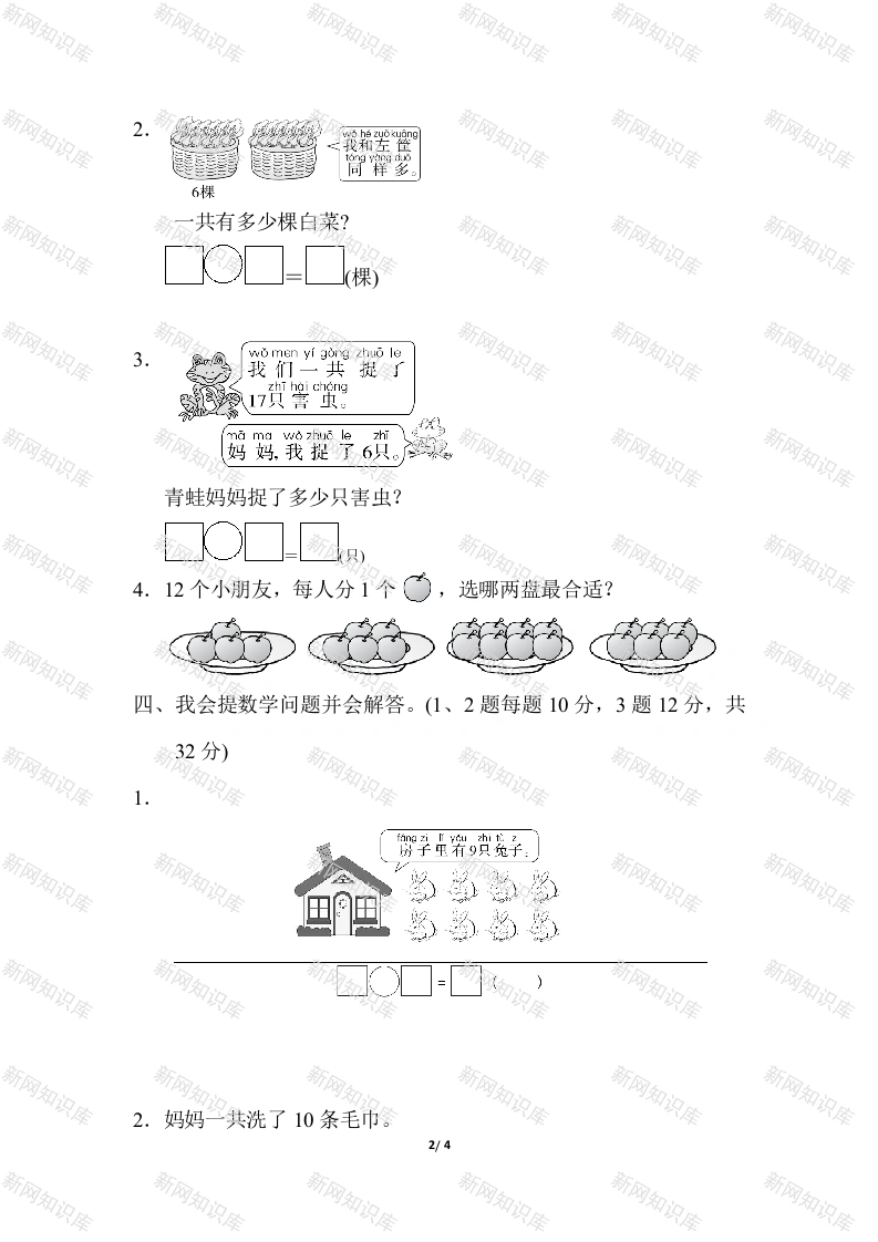 期末总复习重难点突破卷3解决有趣的生活问题一、我会算。(每题6分,共12分)1.在括号里填上合适的数。9-()=58+()=1516-()=10()-5=104+()=1114-()=42.在里填上w<”或“=”。14○130○1020-+15)9+516-5(7+811+59+8二、我会看图列式计算。(每题4分,共16分)1.蔬2.建宝朵108816为?个○☐-☐()3.○○○O4.分000009)()90909909○■-三、我会解决有趣的生活问题。(每题10分,共40分)1.原来有多少条鱼?☐○□=☐(条)还剩7条1/4