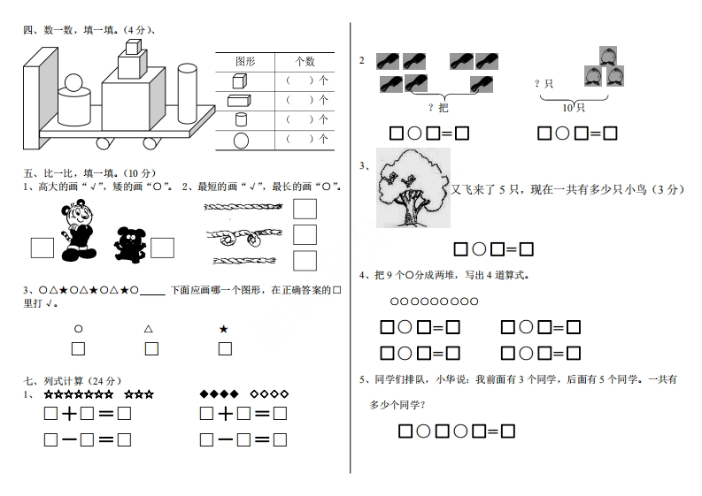 9、在口里填上合适的数一年级上册数学期中试卷口>96+3<▣9-2>☐7<▣<10一、填一填(44分,每空1分)▣>8>▣6+☐=10-28+☐=8-▣6369二、直接写出得数(10分)2、画画填填。4+2=9-3=4+5=6-3=7+0=■■■■■■■■■9+()=104-4=6+4=7-6=10-5=2+8=△△△3+()=9000005+()=87+3=4+4=3+5=0+9=10-8=3、6前面一个数是(),后面一个数是(8-4=7-2=5+5=10-2=6-1=4、和8相邻的两个数是()和().三、找朋友(8分)5、比5大比10小的数有(7-32+76、0000000000O有()个,△有()个。△△△△△△△O比△多()个,△比O少()个.2+88-4的上面画△的下面画O的左面填8的右面填65-51+98、在O里填<、>或=6+31-110○86○68○6+14-4○05+4○1010-3○87-3○2+36+3○7+3