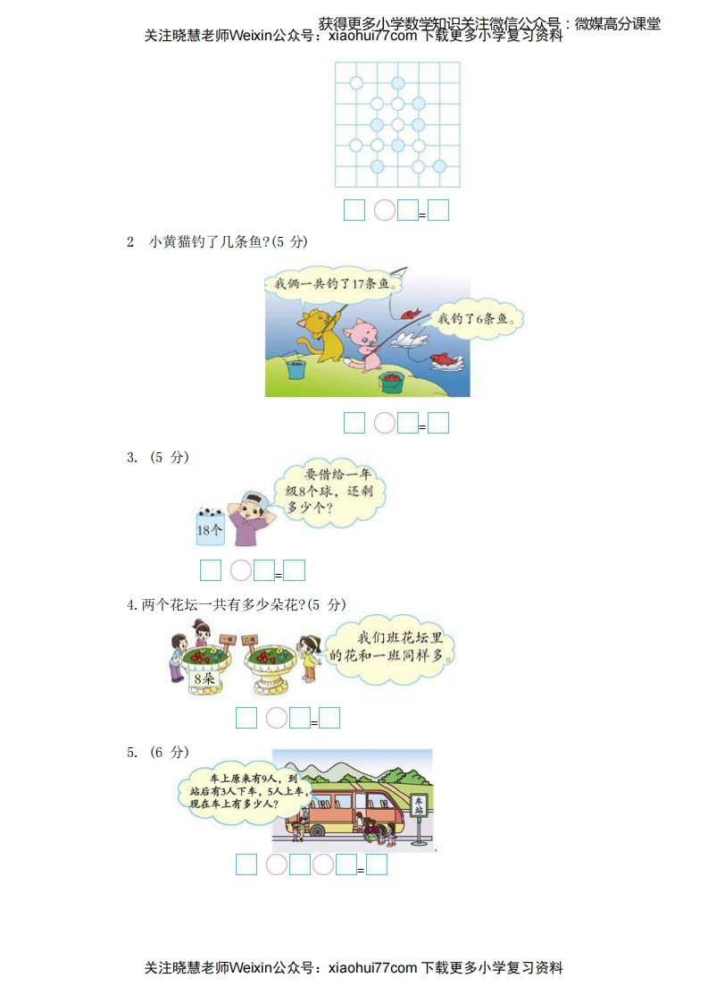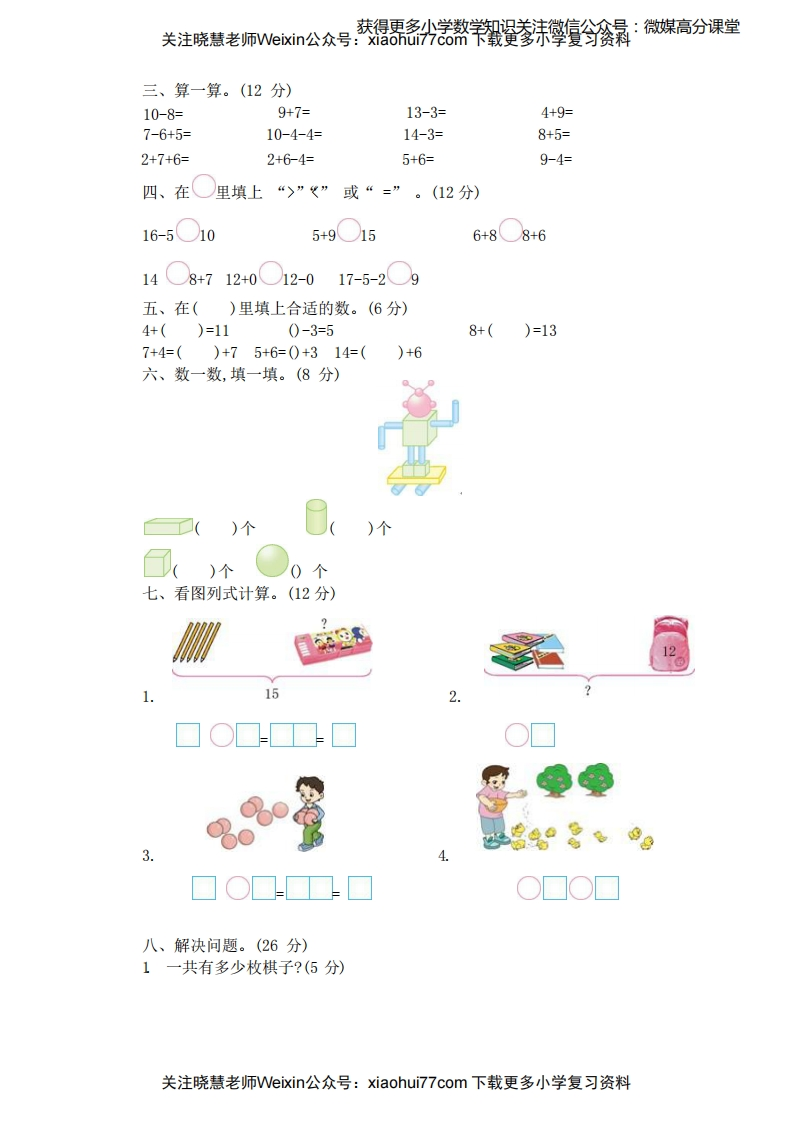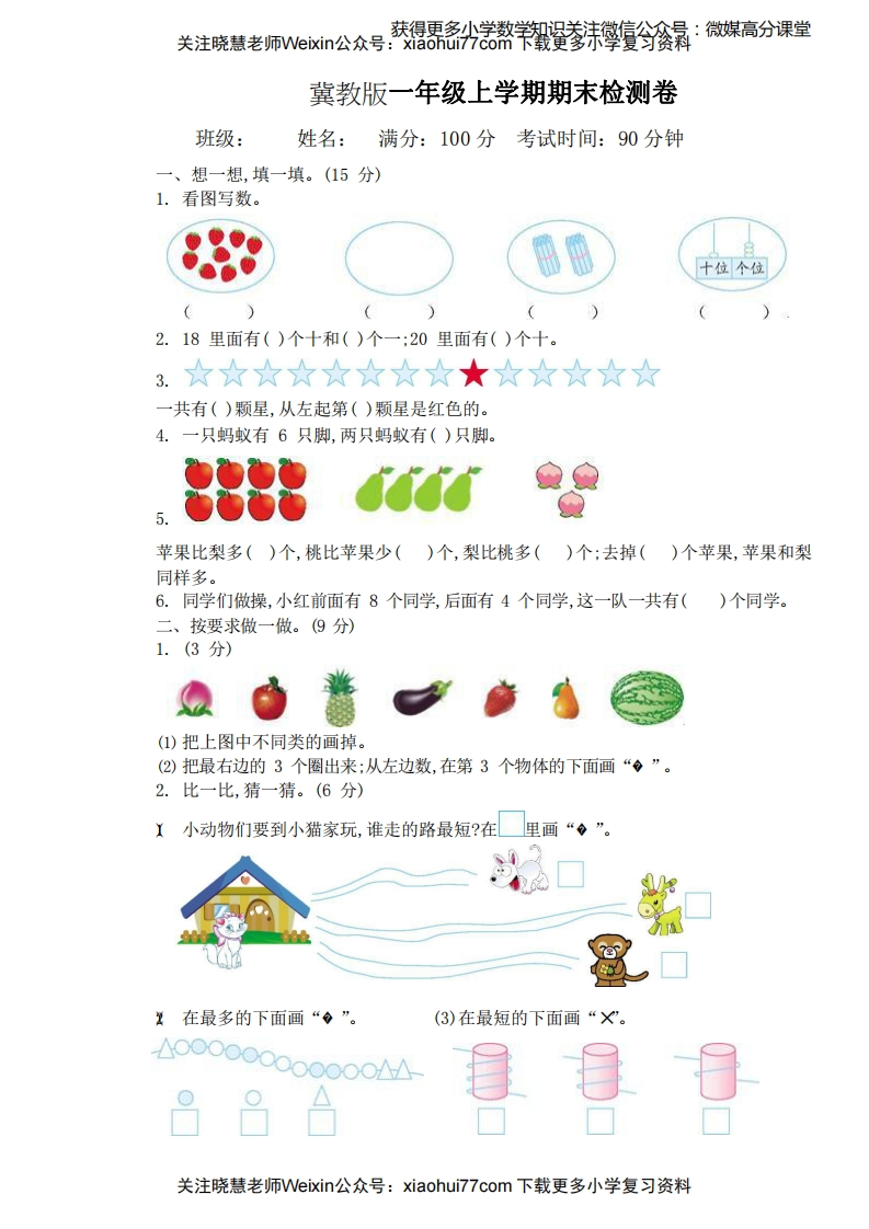 关注晓慧老师Webin公众号·获得熬羊攀宣今会景:微媒高分课堂冀教版一年级上学期期末检测卷班级:姓名:满分:100分考试时间:90分钟一、想一想,填一填。(15分)1.看图写数。65十位个位)(2.18里面有()个十和()个一:20里面有()个十。3.☆☆☆☆☆☆☆☆★☆☆☆☆☆一共有()颗星,从左起第()颗星是红色的。4.一只蚂蚁有6只脚,两只蚂蚁有()只脚。5.苹果比梨多()个,桃比苹果少()个,梨比桃多()个:去掉()个苹果,苹果和梨同样多。6.同学们做操,小红前面有8个同学,后面有4个同学,这一队一共有()个同学。二、按要求做一做。(9分)》1.(3分)(1)把上图中不同类的画掉。(2)把最右边的3个圈出来:从左边数,在第3个物体的下面画“。”。2.比一比,猜一猜。(6分)小动物们要到小猫家玩,谁走的路最短?在里画“。”。复在最多的下面画“。”。(3)在最短的下面画“X”。0000000o0000A△88关注晓慧老师Veixin公众号:xiaohui777com下载更多小学复习资料