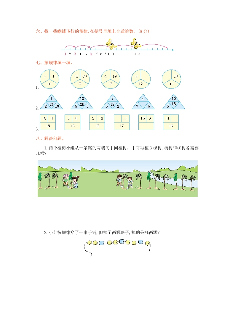 冀教版数学一年级上册第十单元测试卷及答案xmtt884个月前发布关注私信0.58MB3页05410 第1页 / 共3页 第2页 / 共3页 第3页 / 共3页 已完成全部阅读,共3页 冀教版数学一年级上册第十单元测试卷及答案此内容为付费资源,请付费后查看¥1¥2会员服务免费立即购买您当前未登录!建议登陆后购买,可保存购买订单付费资源© 版权声明文章版权归作者所有,未经允许请勿转载。THE END数学 文本预览 第十单元测试卷一、按图形的排列规律接着画。1.②四©因©四因巴⑧△◇◇△◇◇△◇3.○0◇○○◇○○◇二、后面的一个应该是什么?圈一圈。WW周南动骨卧南南由曲南章事章事亭事亭事攀三、找一找,圈一圈2.○△○○△△○○○△△△C○△○○△△,.☐◇◇☐◇◇◇□◇◇◇◇☐◇◇☐◇◇)四、看图列式计算。菜刻额皱黎菜彩职解黎+■=■+■五、里可以填什么?8+5=5+☐9+3=3+☐13+66+☐ 查看更多 收起部分 喜欢就支持一下吧点赞10 分享QQ空间微博QQ好友海报分享复制链接收藏