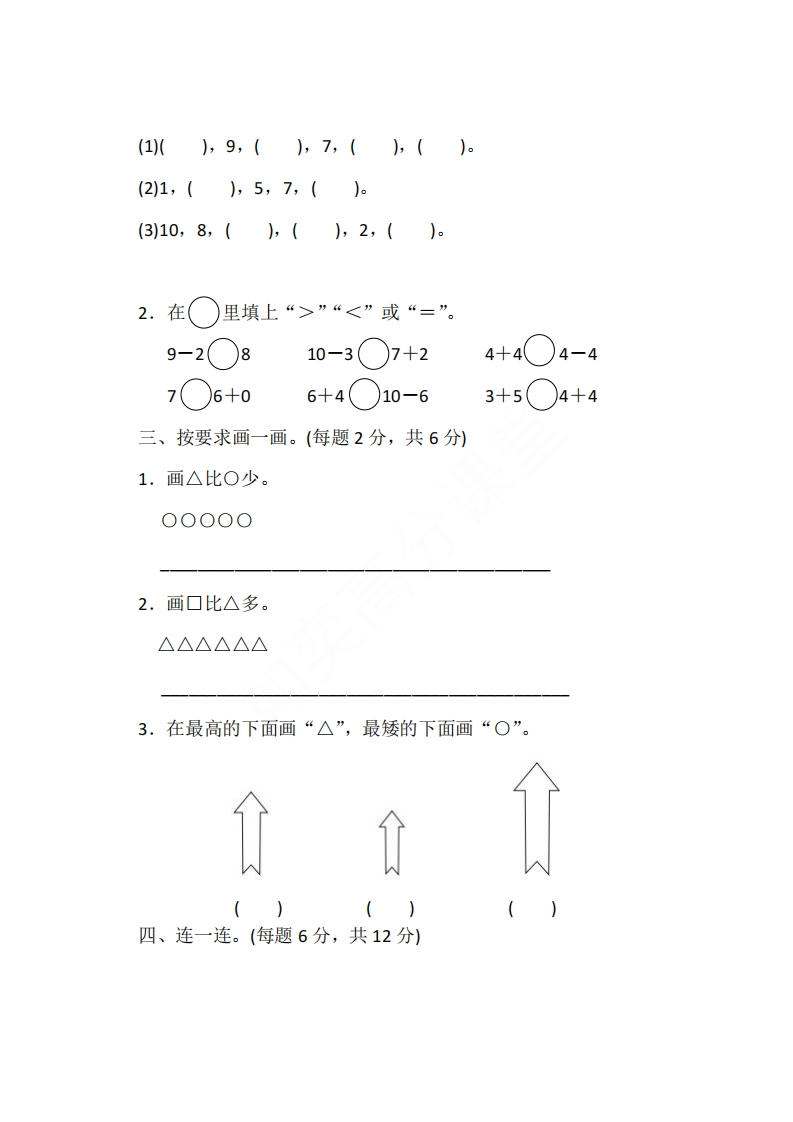 北师大版一年级上册期中检测卷xmtt884个月前发布关注私信0.58MB7页04411 第1页 / 共7页 第2页 / 共7页 第3页 / 共7页 试读已结束,还剩4页,您可下载完整版后进行离线阅读 北师大版一年级上册期中检测卷此内容为付费资源,请付费后查看¥1¥2会员服务免费立即购买您当前未登录!建议登陆后购买,可保存购买订单付费资源© 版权声明文章版权归作者所有,未经允许请勿转载。THE END数学 文本预览 北师大版数学一年级第一学期期中测试卷1时间:60分钟,满分100分题号三四五六七八总分得分看图圈数。(6分)Y图图y醉荷图33000000089106毁000O△△△△△△56876二、填一填。(1题10分,2题12分,共22分)1.按规律填数。 查看更多 收起部分 喜欢就支持一下吧点赞11 分享QQ空间微博QQ好友海报分享复制链接收藏