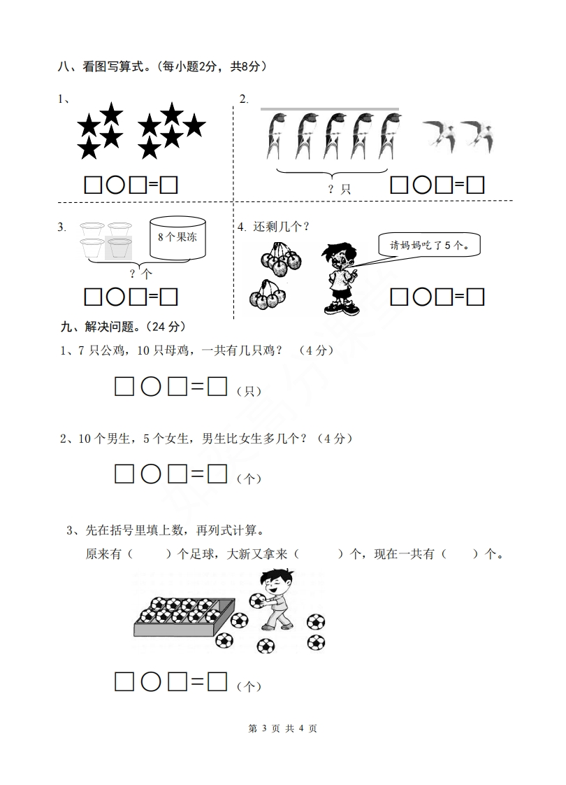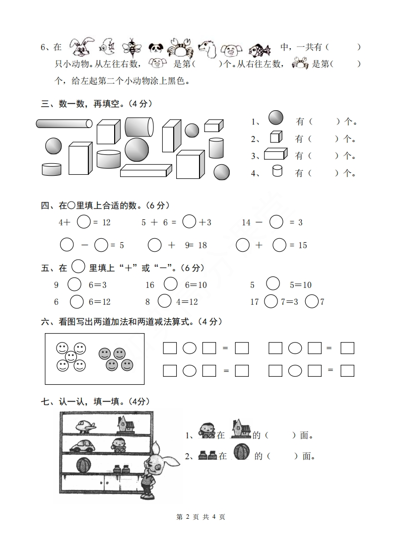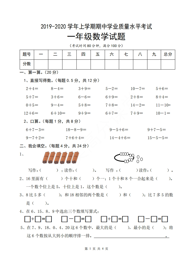 2019-2020学年上学期期中学业质量水平考试一年级数学试题(考试时间80分钟,满分100分)题号四五六七八九总分分数一、算一算。(20分)1、直接写得数。(每题0.5分,共12分)2+4=8-4=3+9=5-2=10-7=5+6=5+7=3+6=6-6=6+9=2+8=8+4=0+5=9-4=5+8=7+8=14-2=11-10=12+6=6+10=9+9=6+7=7+9=10-1=2、口算。(每题1分,共8分)6+7-3=18-8-9=9-5+6=9+7-5=9-7+2=7+6+4=14-4+6=15-5-5=二、我会填空。(每题4分,共24分)10o080写作:();读作:()a写作:()读作:(2、16里面有()个十和()个一1个十和8个一合起来是(一个数个位上是5,十位上是1,这个数是()。3、8比5多():和18相邻的两个数是()和():比7多5的数是()。4、在6、15、8、9中选出三个数填写算式:□+□=□□-□=□□+□=□□-□=□5、在7、9、18、0、4、20这6个数中,最大的是(),最小的是():将这6个数按从大到小的顺序排一排。第1页共4页