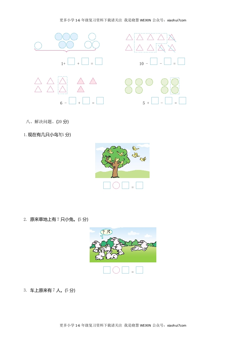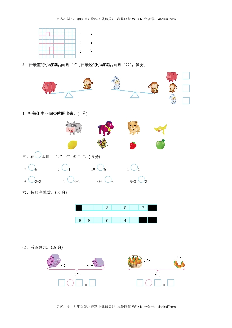 更多小学16年级复习资料下载请关注我是晓慧WEIXIN公众号:xiaohui7com2019-2020学年上学期一年级期中检测卷班级:姓名:满分:100分考试时间:90分钟题序第一题第二题第三题第四题第五题第六题第七题第八题总分一、算一算。(15分)得分2+6=7+3=4-48+2=3+5=6-3=8-2=1+3=0+8=2+2=10-7+3=4+5+1=2+5-4=9-5-4=8-1+2=二、找规律,填一填。(3分)人三、看图填一填。3分)一共有()个图形,是第()个,√是第()个。四、比一比,分一分。(15分)圣1.在高的下面画“k”。(2分)2.在最长的后面画“k”。(3分)更多小学1-6年级复习资料下载请关注我是晓慧WEIXIN公众号:xiaohui7com
